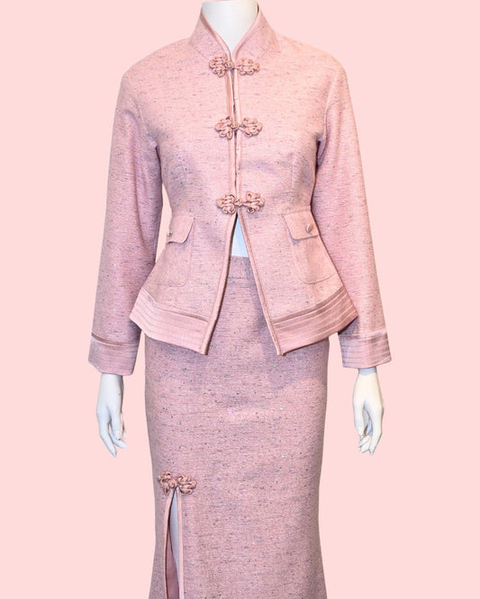 Baby Pink Tweed Shimmer Tang Peplum Jacket + Medi Skirt (Set)