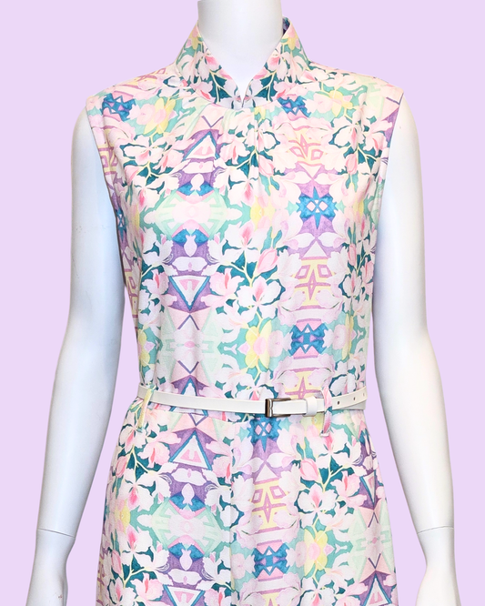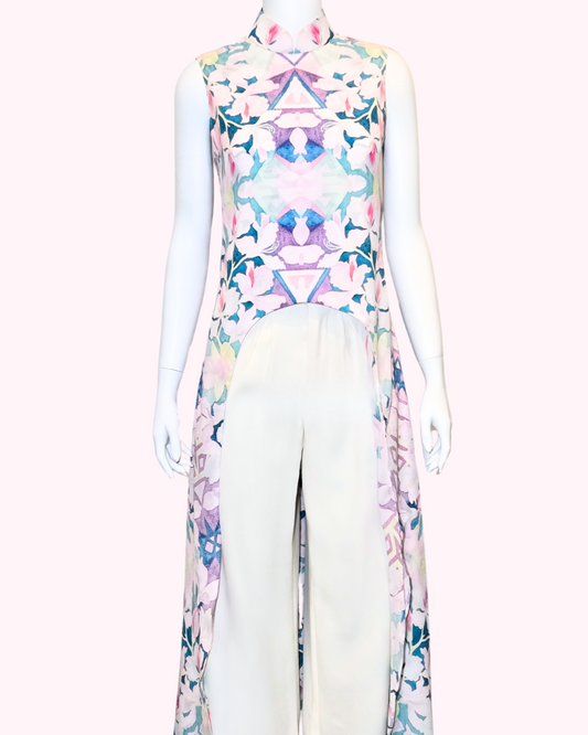 Floral Crepe Low-High Cheongsam Cape + White Mandarin Collar Trousers (Set)