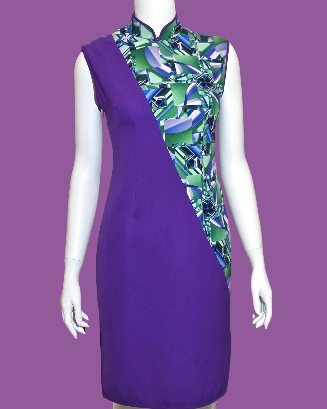 Exude modern elegance with this Lavender Purple Asymmetric Cheongsam. The soft lavender hue combines with a chic asymmetric design, creating a sophisticated yet contemporary look.