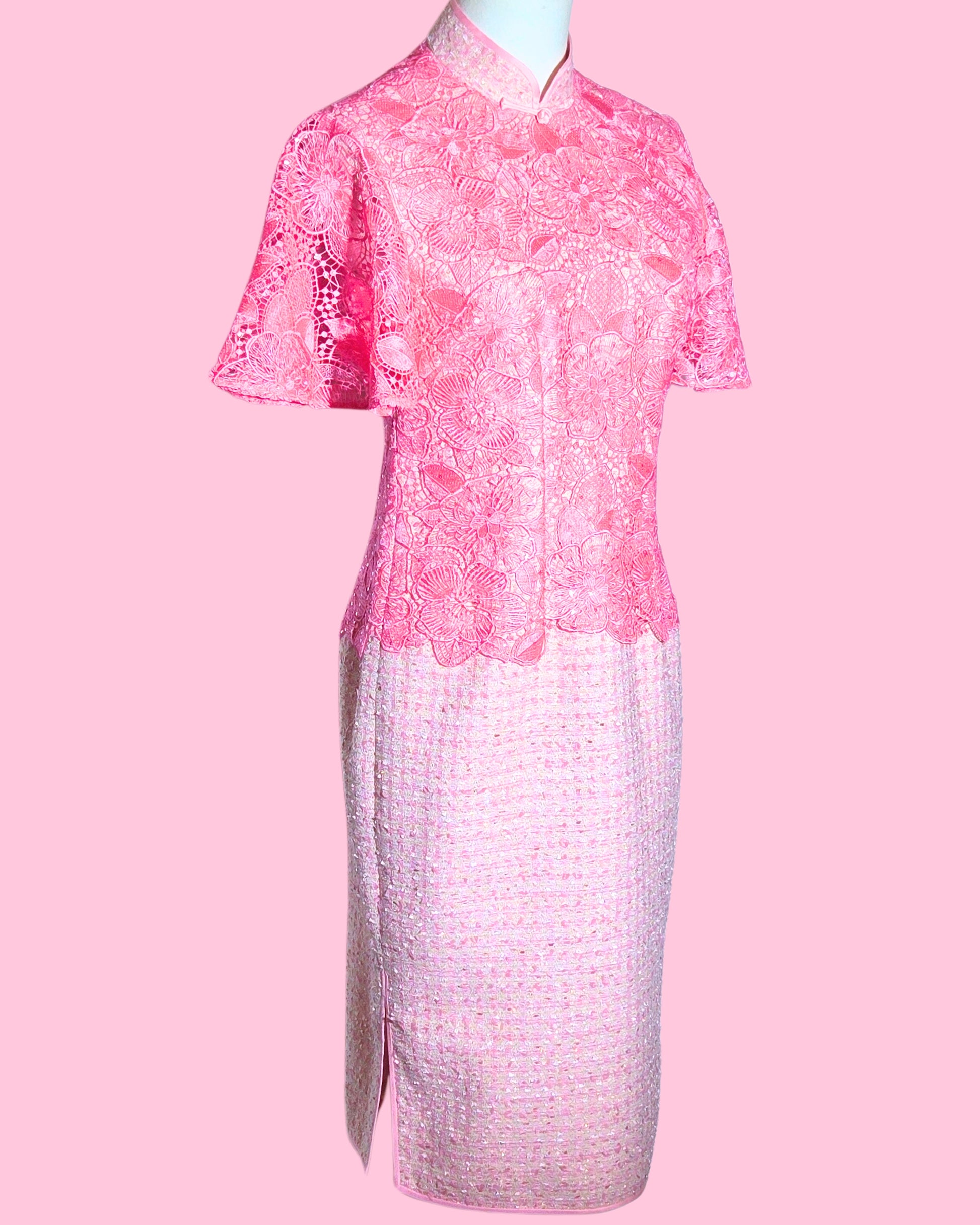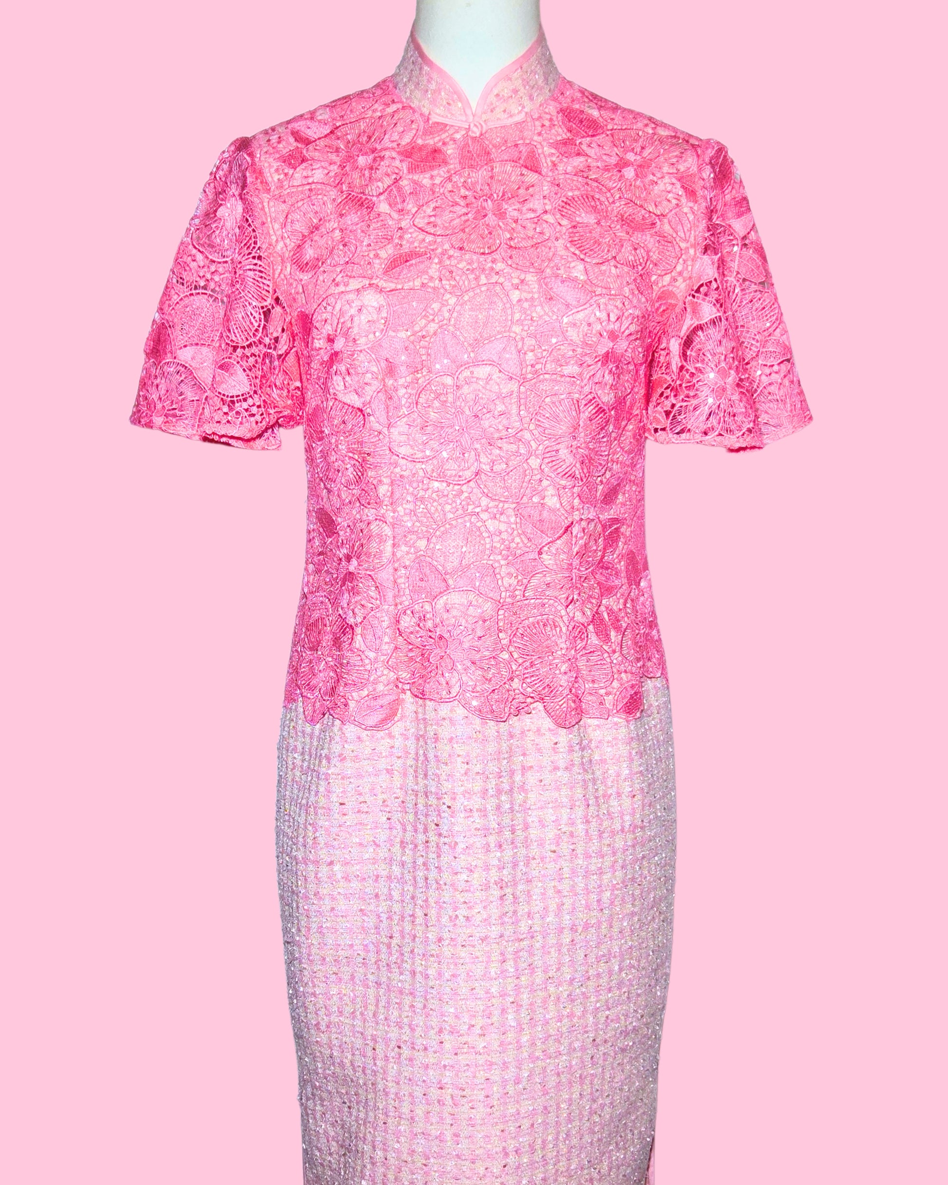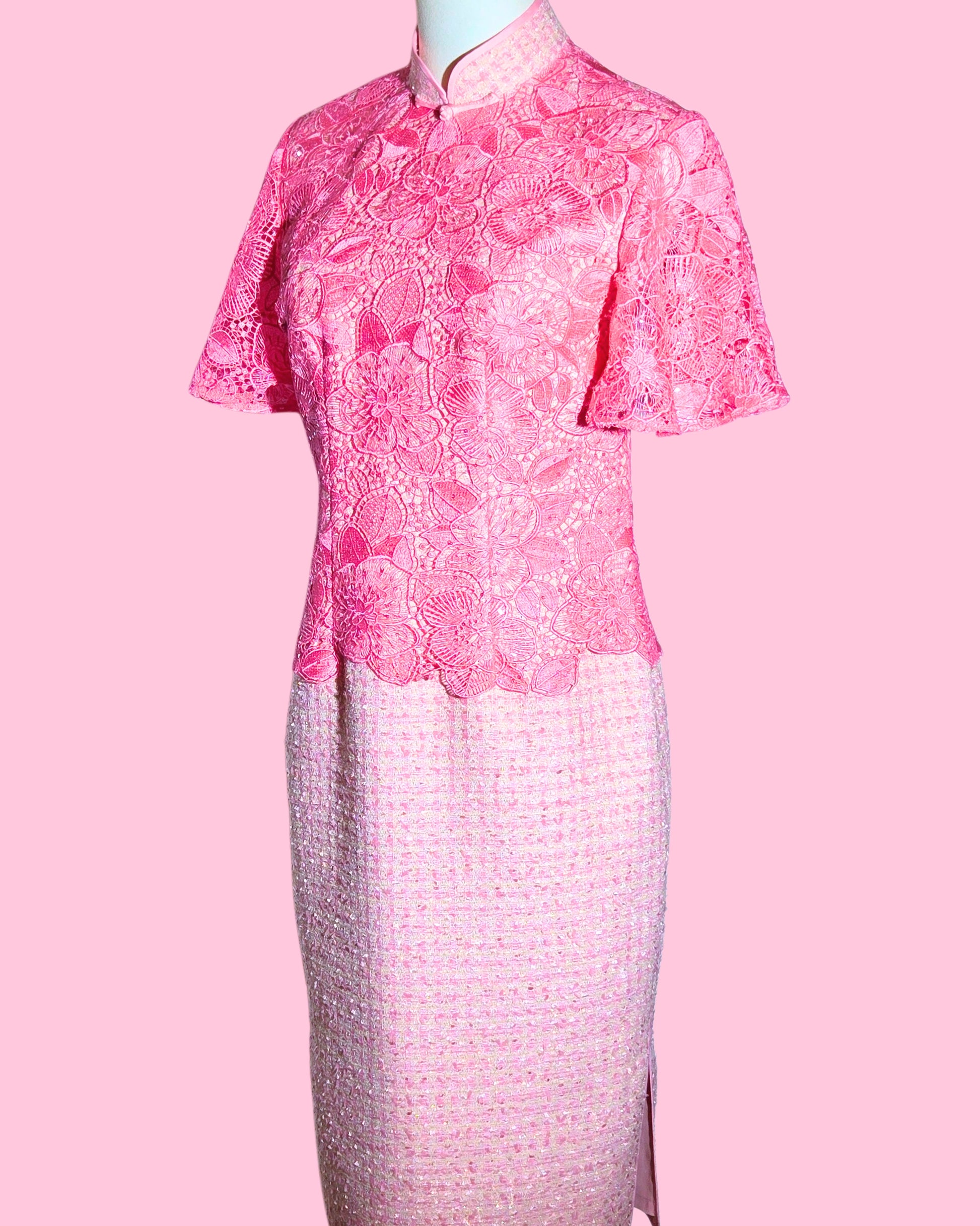 The Baby Pink Tweed Lace Cheongsam combines elegance and modern design with its delicate lace and soft tweed fabric. Featuring a flattering silhouette, short sleeves, and a high neckline, this charming piece is perfect for special occasions. Its intricate details and lovely baby pink color make it a stylish celebration of individuality and heritage.