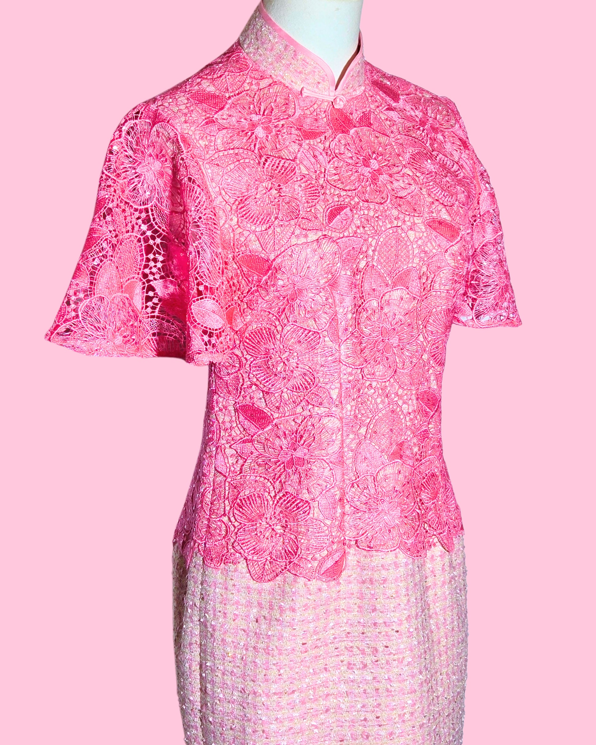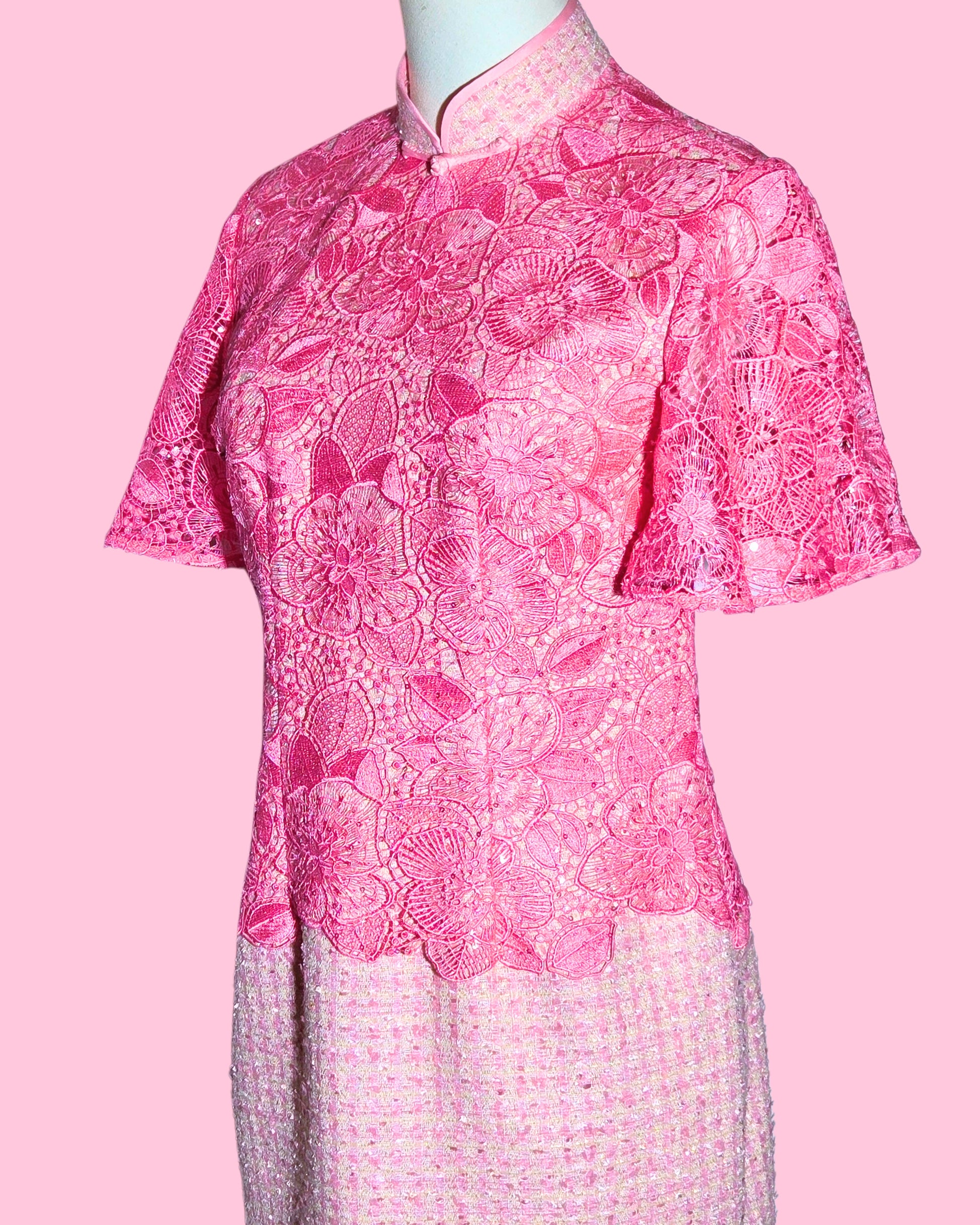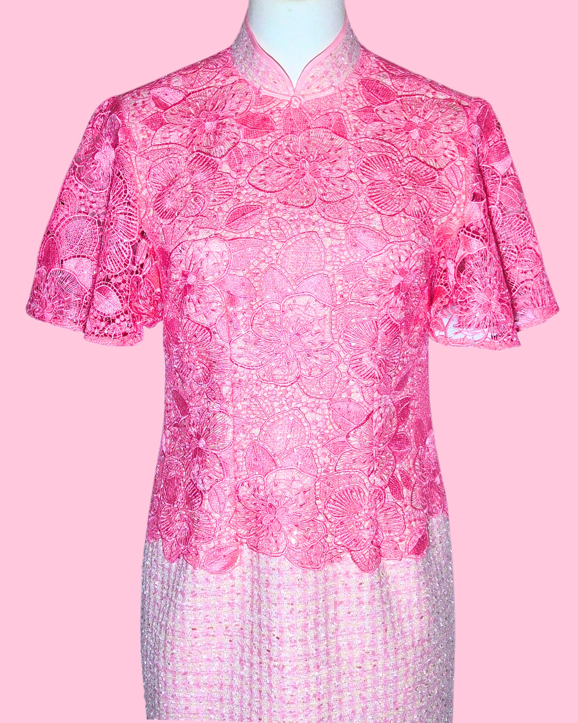The Baby Pink Tweed Lace Cheongsam combines elegance and modern design with its delicate lace and soft tweed fabric. Featuring a flattering silhouette, short sleeves, and a high neckline, this charming piece is perfect for special occasions. Its intricate details and lovely baby pink color make it a stylish celebration of individuality and heritage.