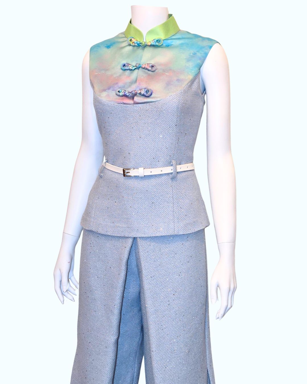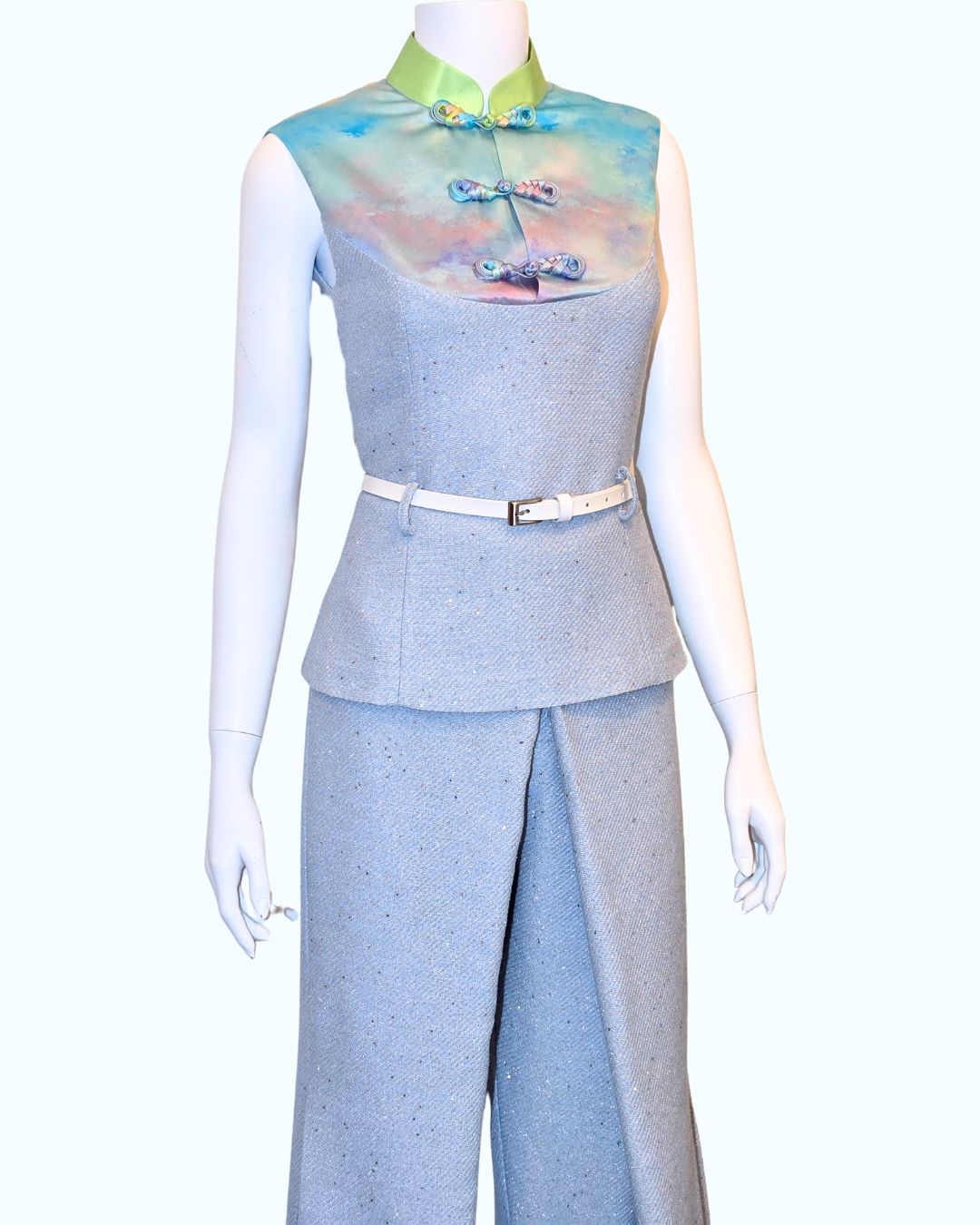 Step into style with the Baby Sequin Tweed set featuring a stunning Sky Painting print by Sindy Chiu. The sleek top showcases a shimmering sequin texture, complemented by a vibrant, artistic print that captures the essence of the sky.