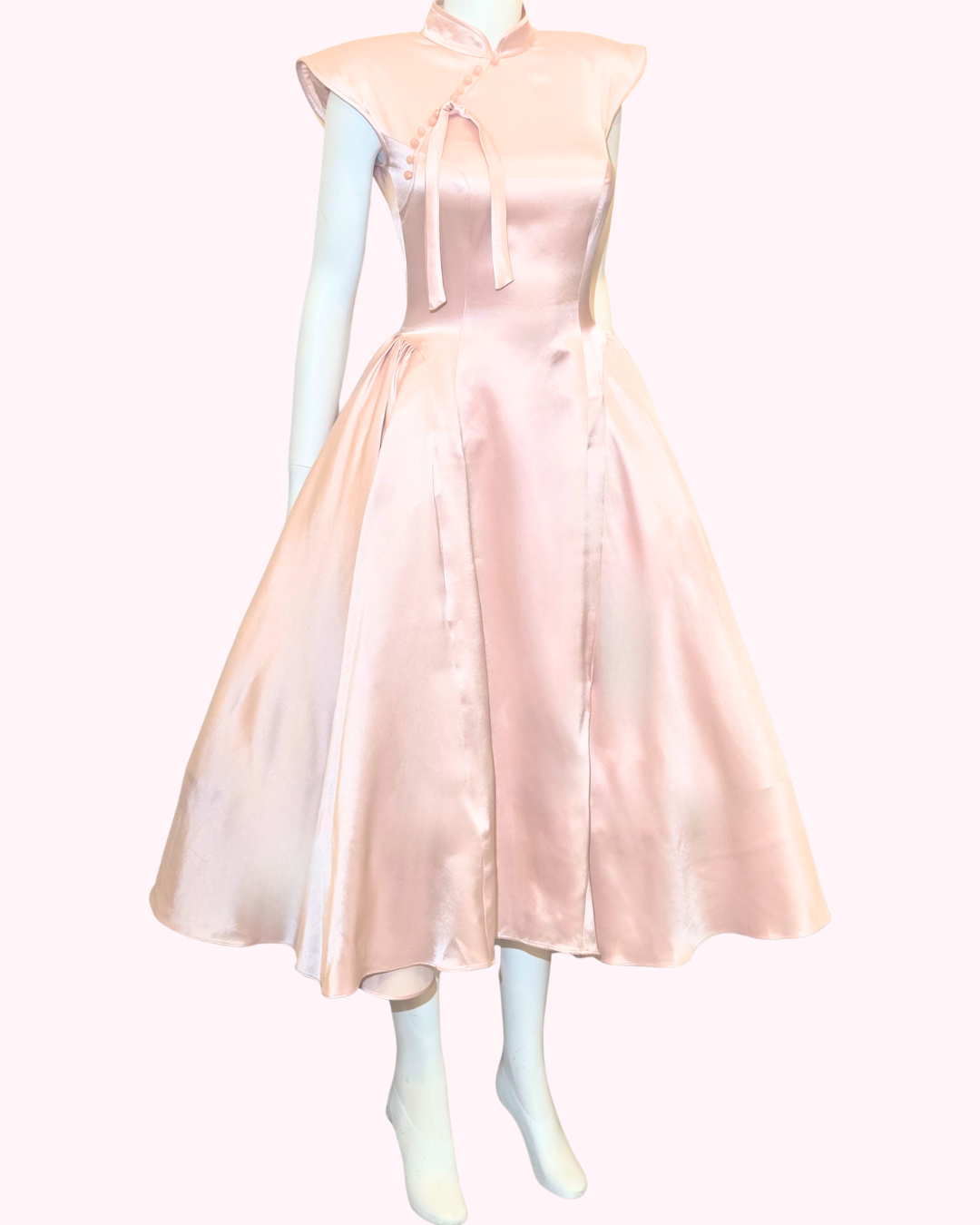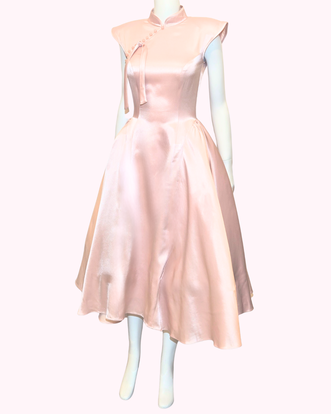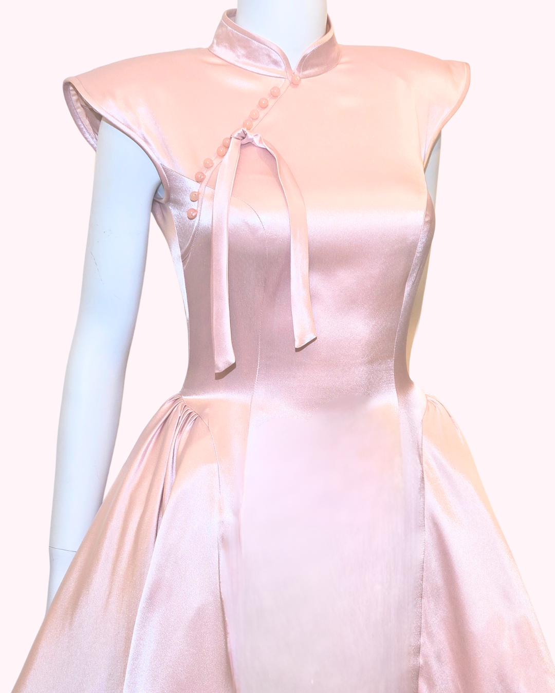 Embrace classic elegance with the Dust Rose Panier Cheongsam. This beautifully crafted piece features a soft dust rose satin finish that radiates sophistication.