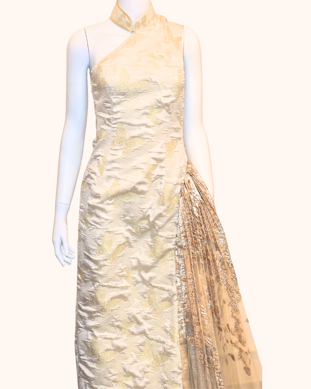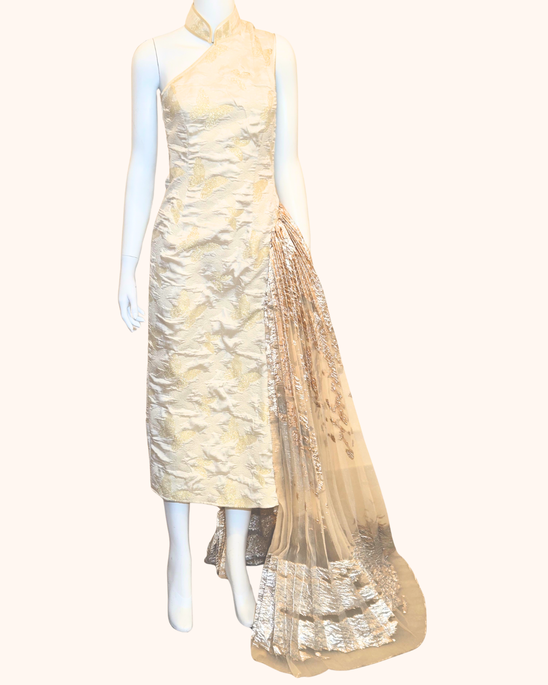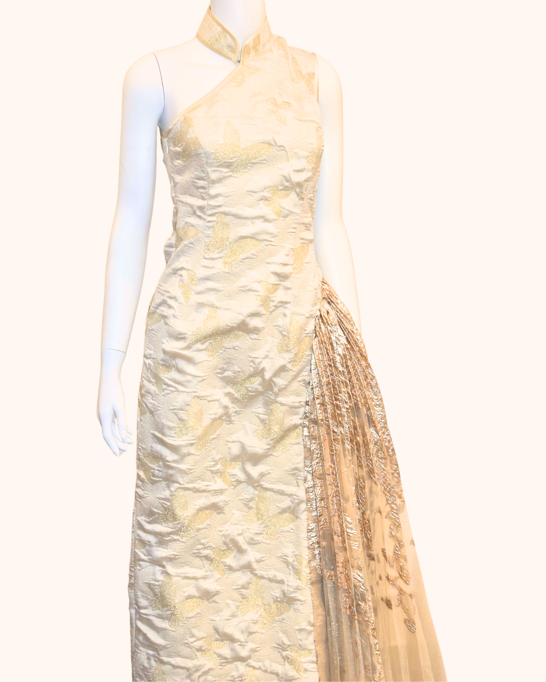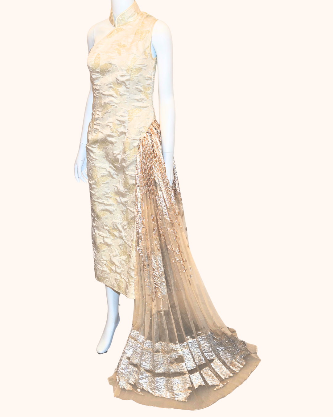 The asymmetric silhouette is enhanced by elegant pleats that flow gracefully, adding a touch of drama to the ensemble. Perfect for formal events or special occasions, this cheongsam combines traditional elegance with contemporary flair, ensuring you stand out with sophistication and style.