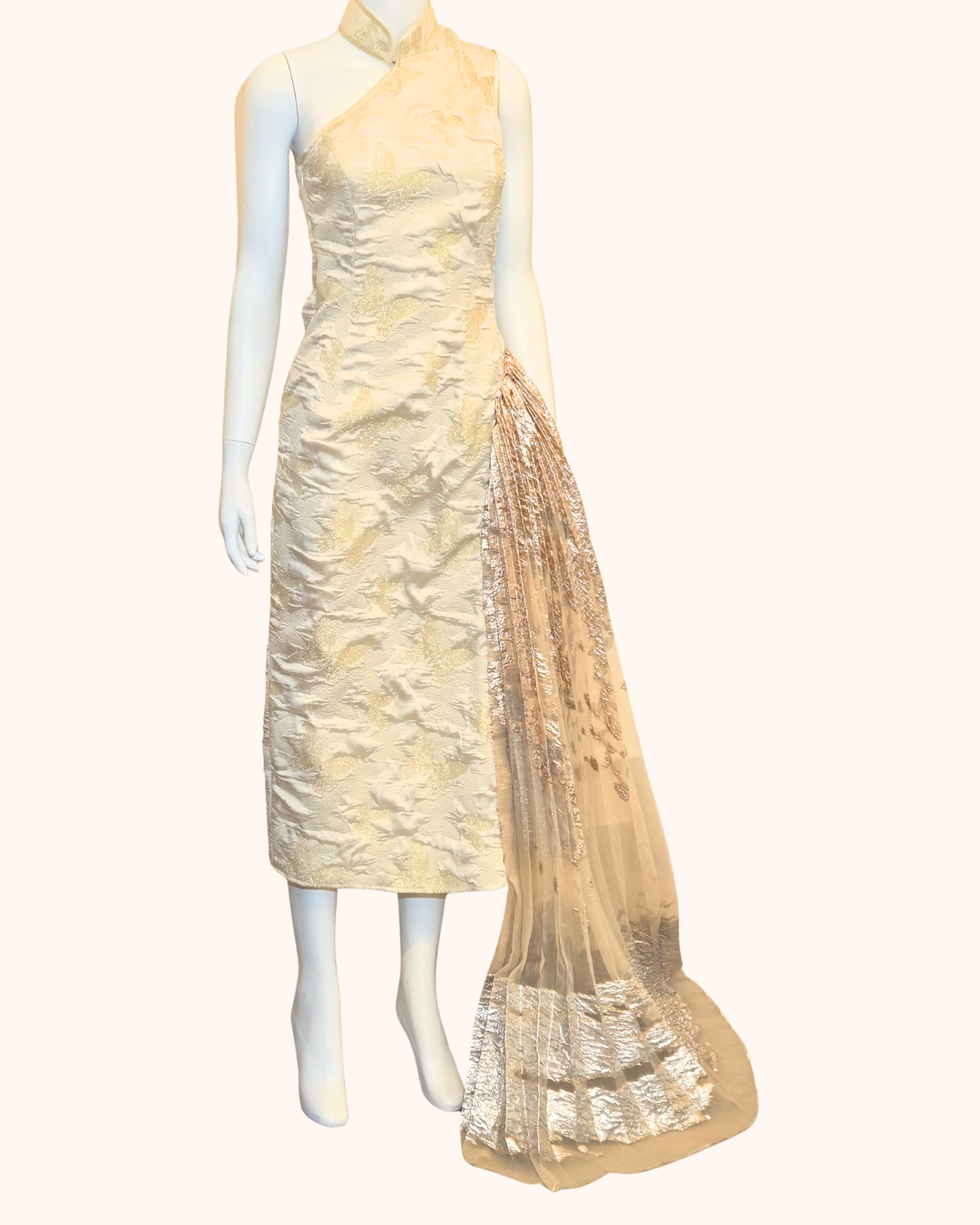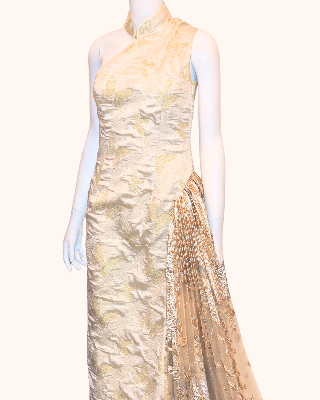 Make a bold statement with the Gold Metallic Asymmetric Pleated Cheongsam. This stunning piece features a luxurious metallic finish that catches the light beautifully, accentuating its unique design.
