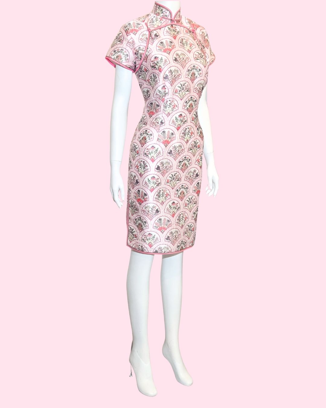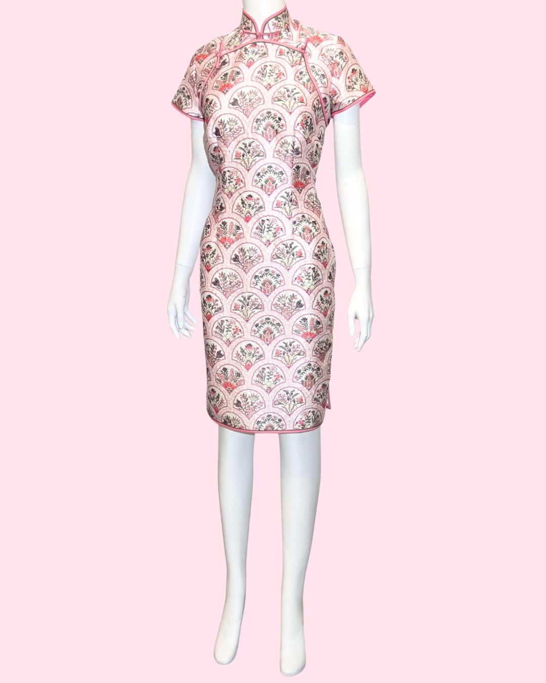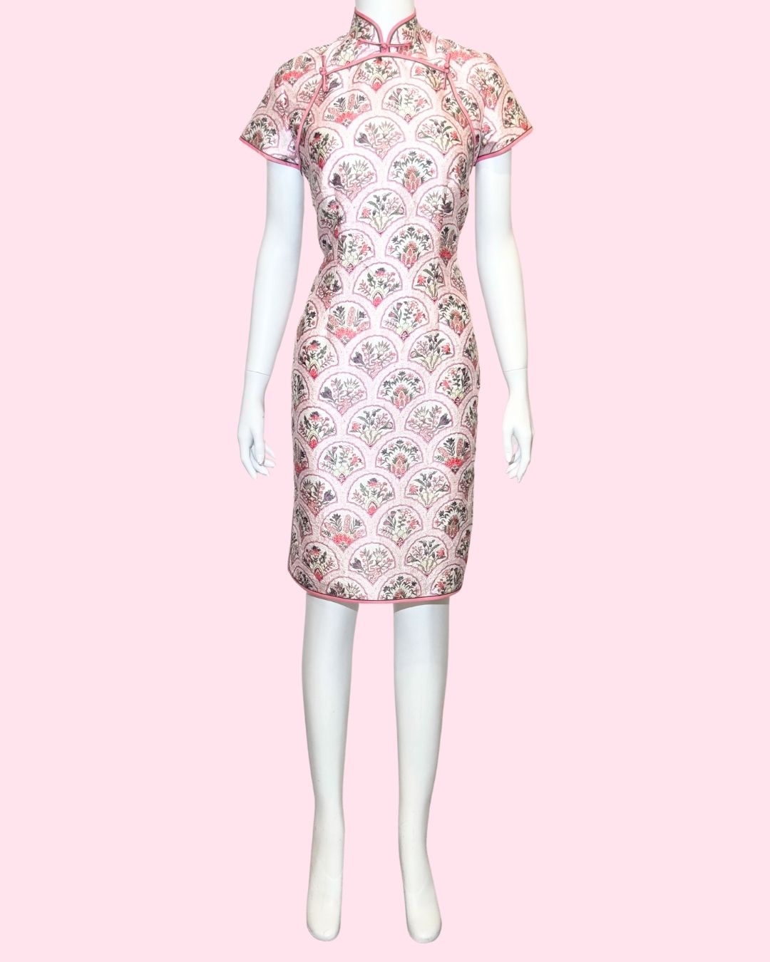 Step into elegance with the Pink Art Deco Cheongsam, a stunning piece that blends classic design with modern aesthetics. Featuring a beautiful art deco pattern in soft pink tones, this cheongsam exudes sophistication and charm.