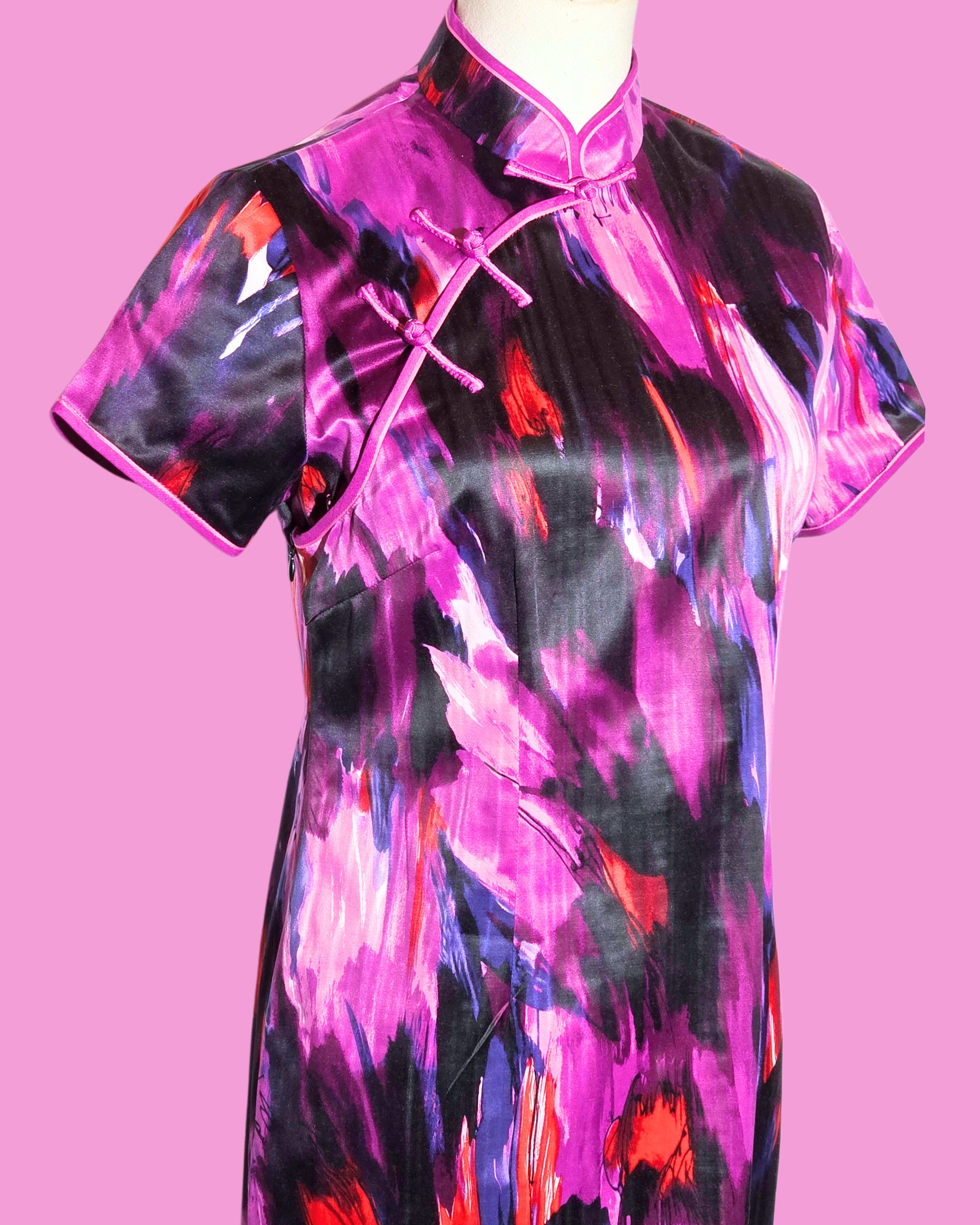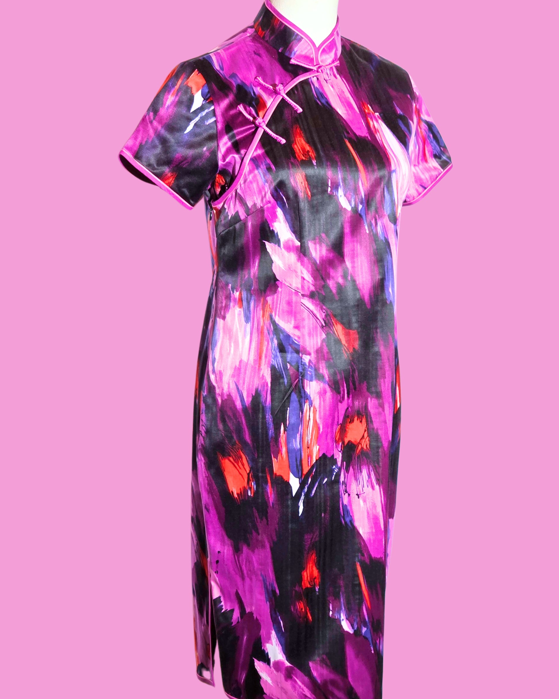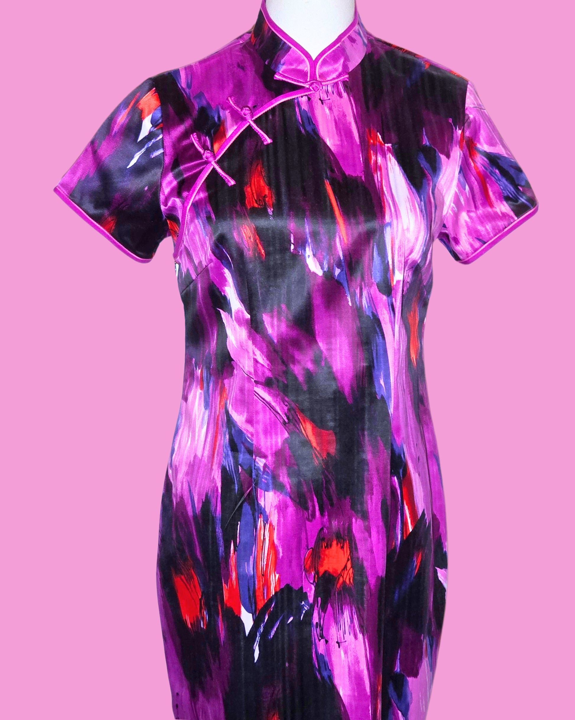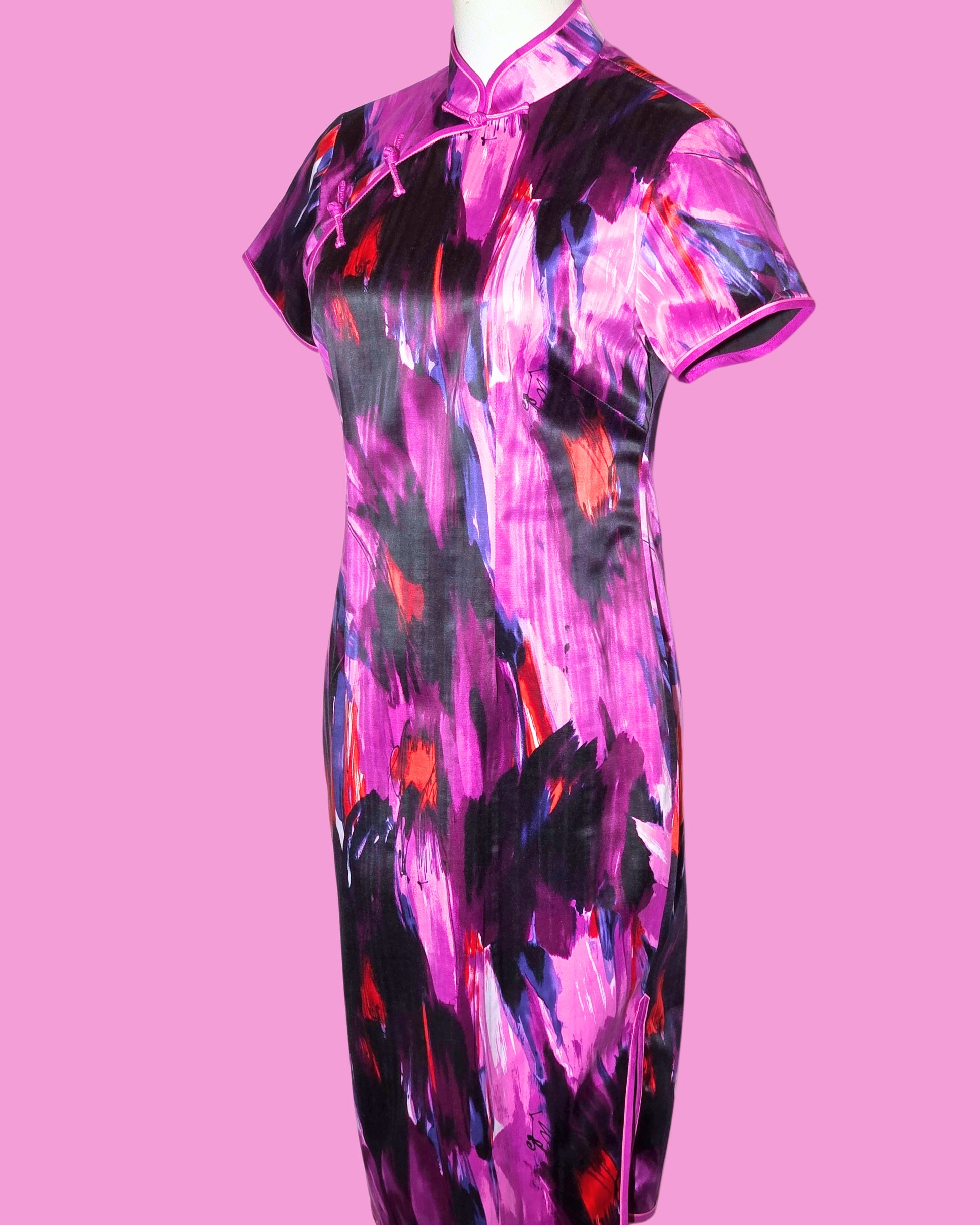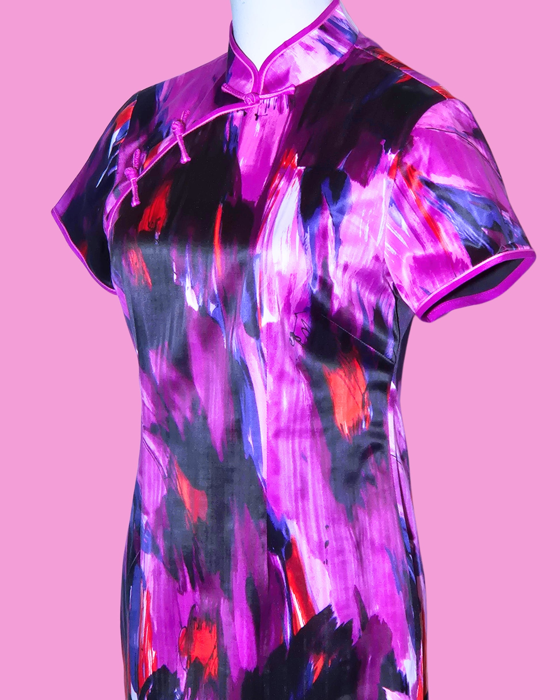 The Purple and Red Brushstroke Cheongsam is a stunning garment that combines artistry with elegance. Featuring a bold brushstroke design in rich purples and vibrant reds, this fitted dress showcases a modern interpretation of traditional style. With its sleek silhouette and short sleeves, it offers a flattering fit that is perfect for both formal occasions and chic gatherings. Make a statement with this eye-catching piece that celebrates color and creativity while enhancing your unique fashion sense.