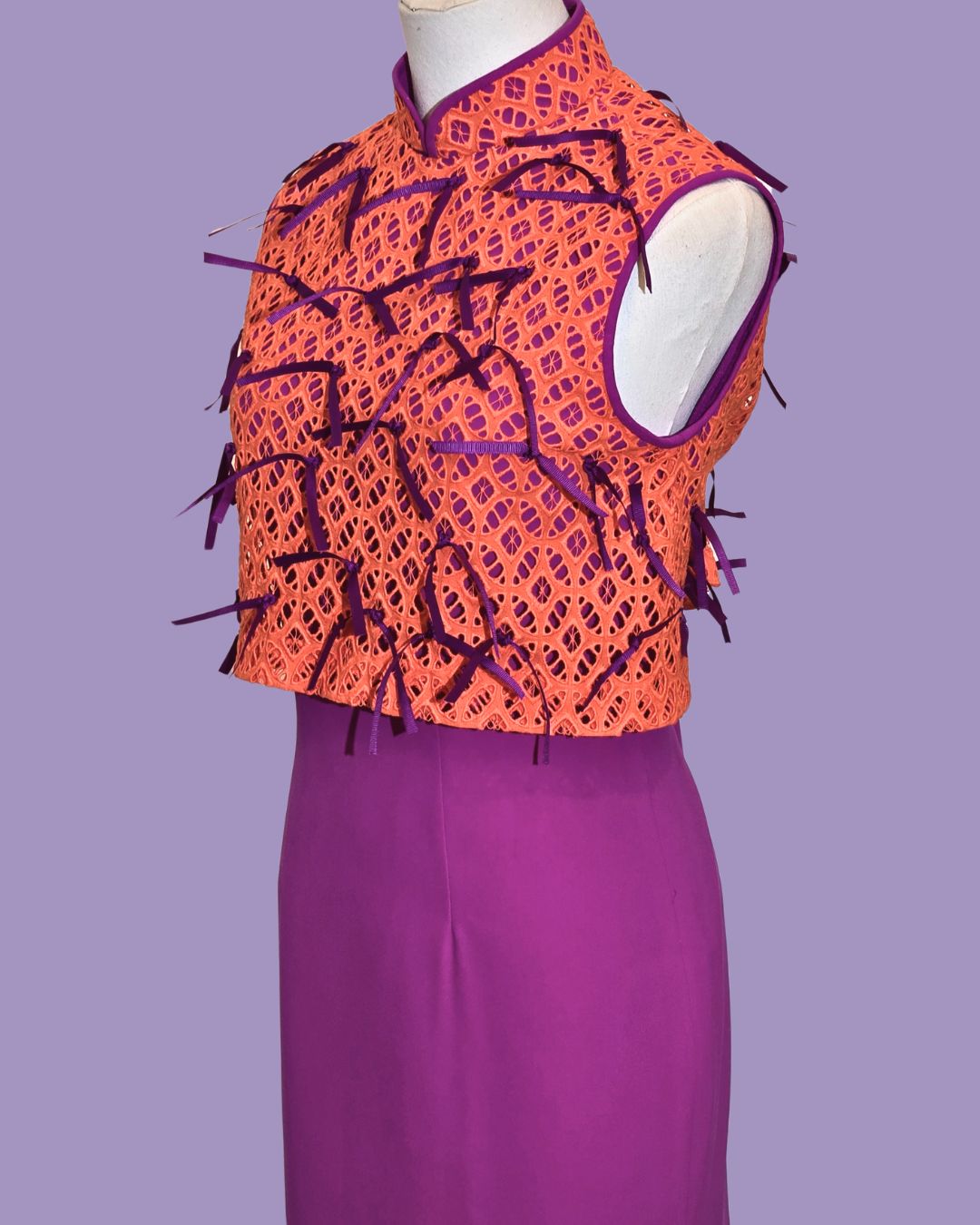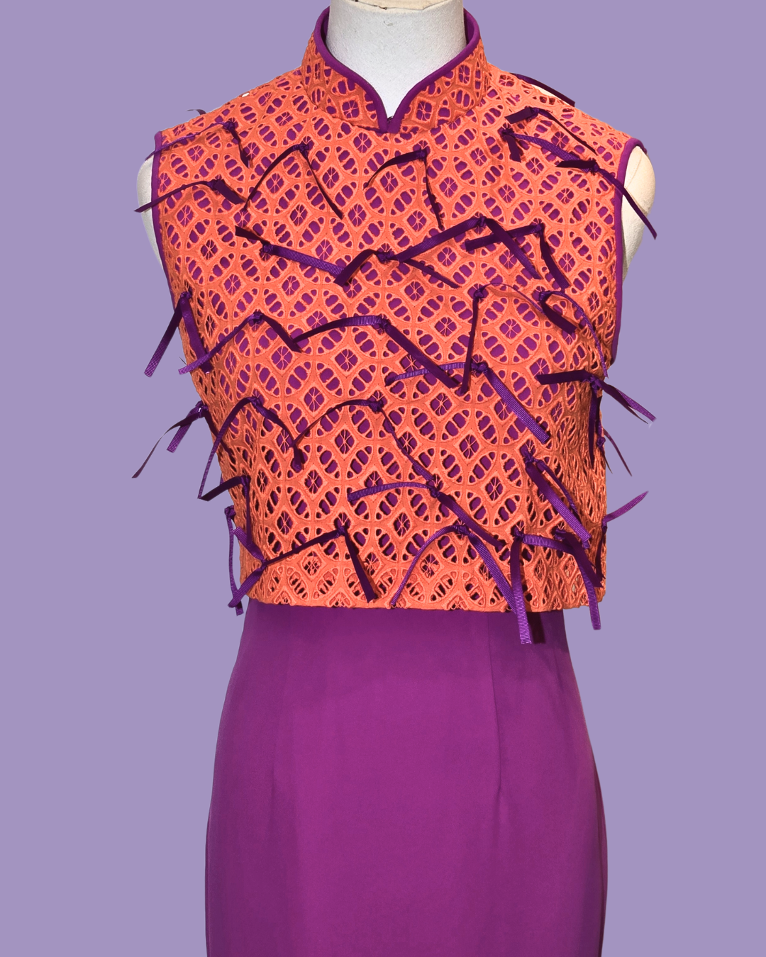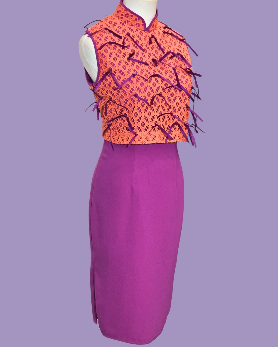 This stunning cheongsam features a vibrant orange bodice with unique ribbon details, paired with a fitted purple skirt. The sleeveless design modernizes the classic silhouette, while high-quality fabric ensures comfort. Perfect for formal occasions, it beautifully blends tradition with contemporary style for a striking look.