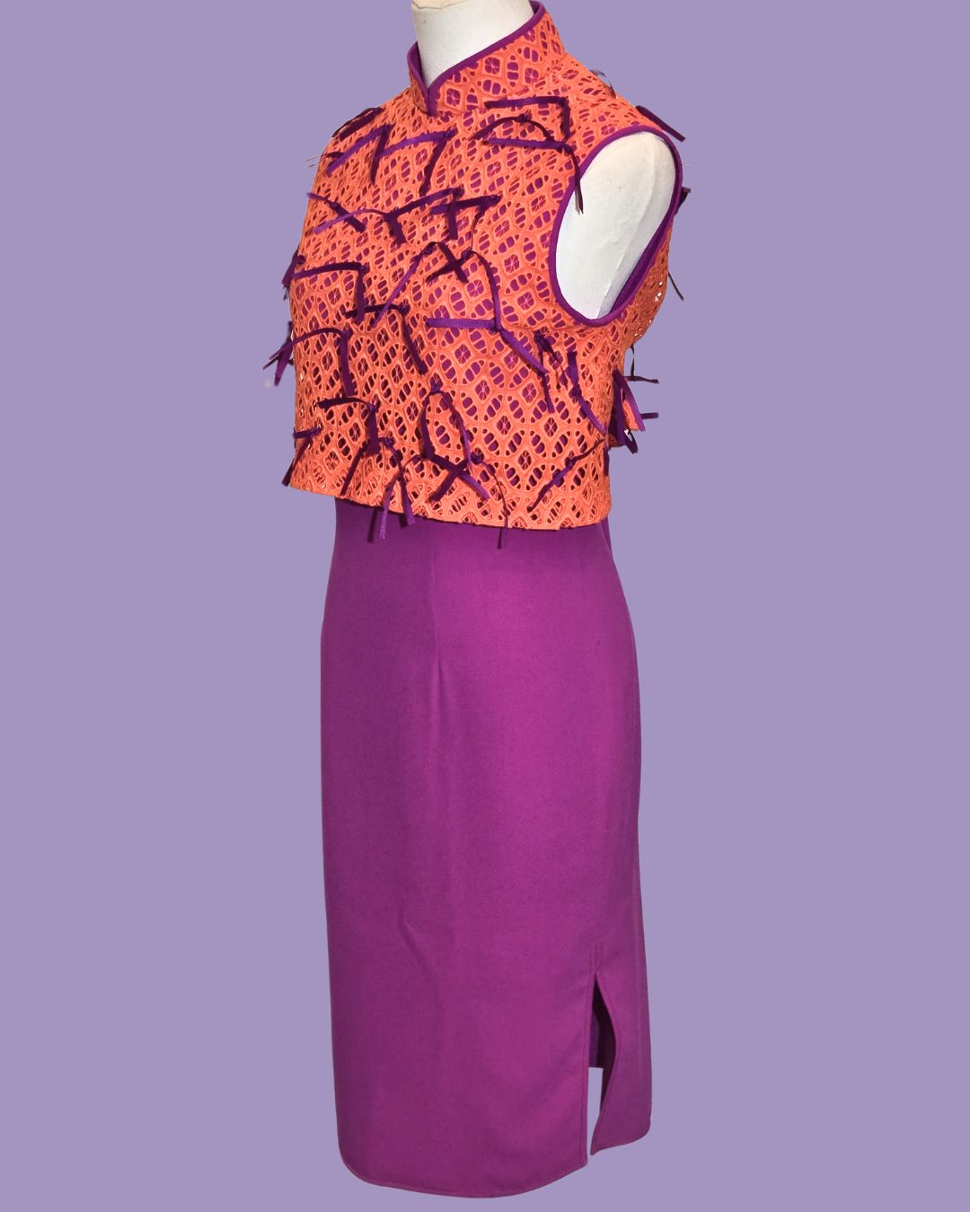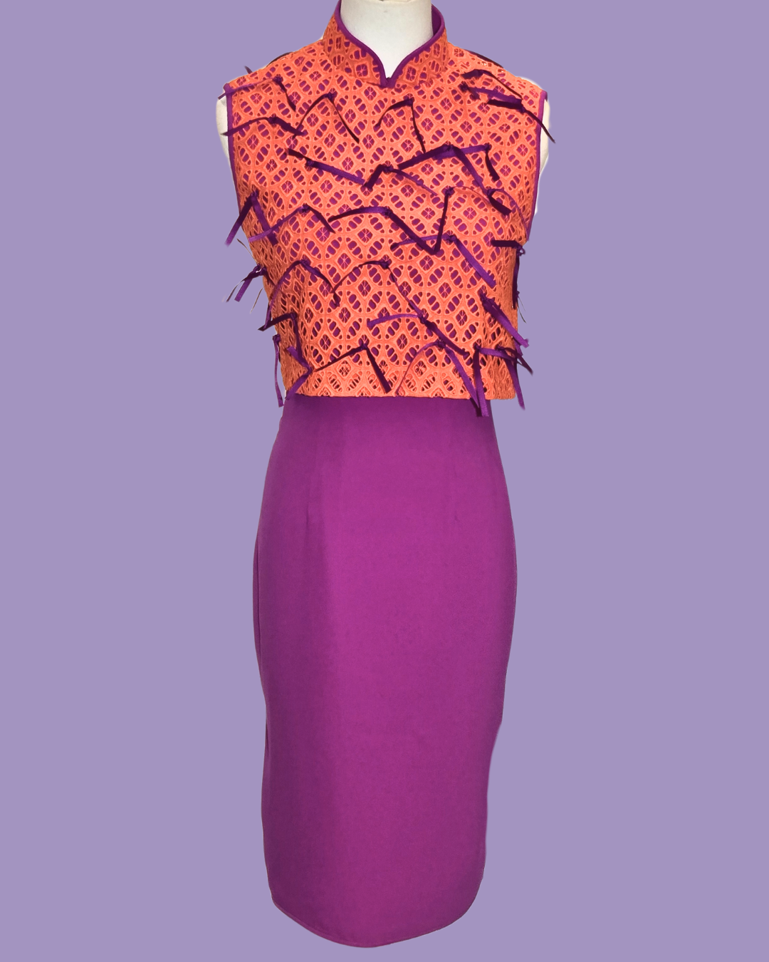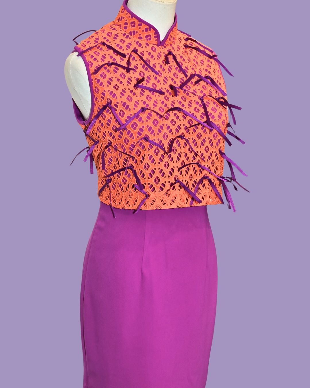 This stunning cheongsam features a vibrant orange bodice with unique ribbon details, paired with a fitted purple skirt. The sleeveless design modernizes the classic silhouette, while high-quality fabric ensures comfort. Perfect for formal occasions, it beautifully blends tradition with contemporary style for a striking look.