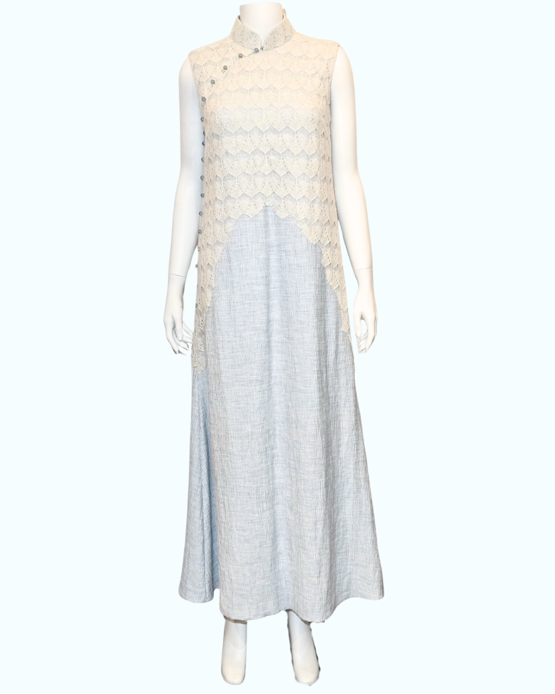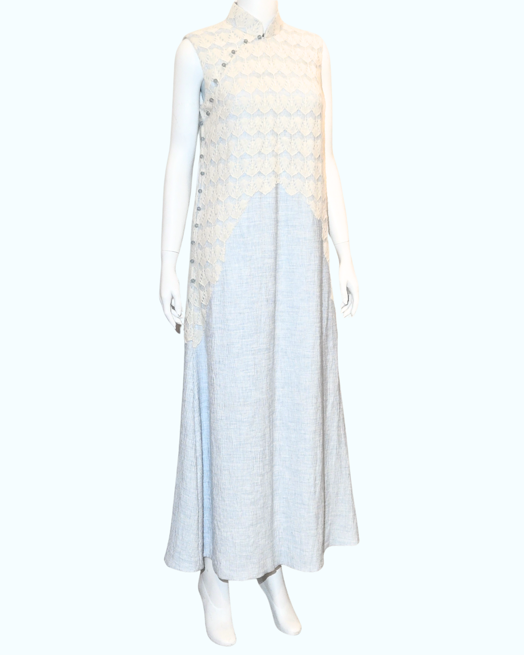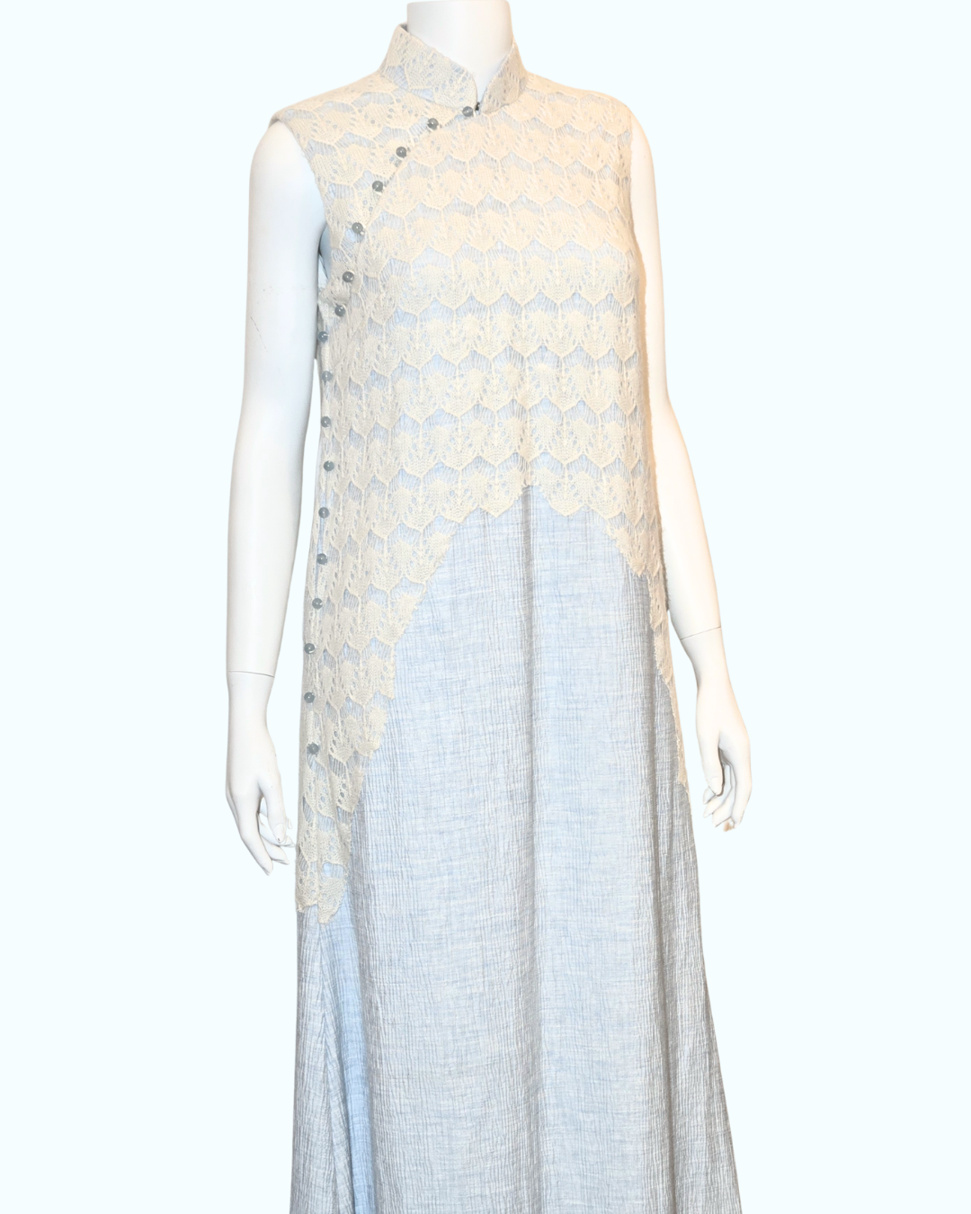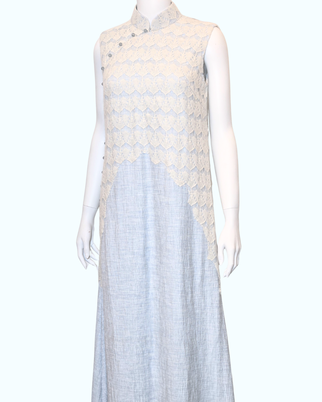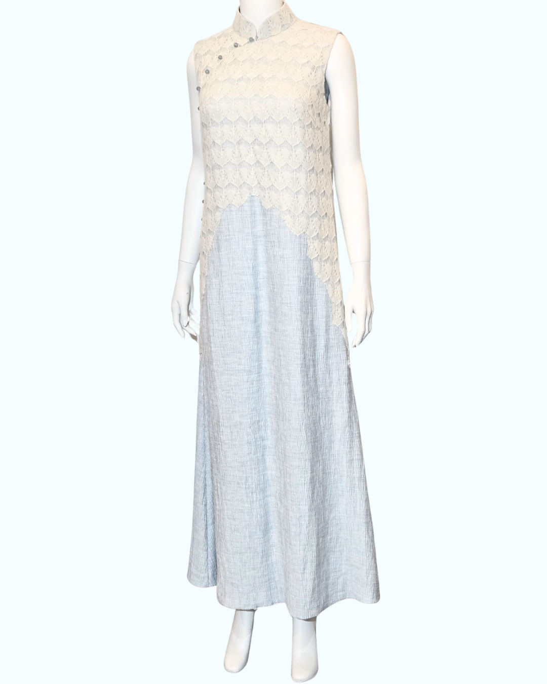 Embrace a serene aesthetic with the Sky Cloud Cheongsam. This elegant piece features a textured bodice that mimics the beauty of clouds, paired with a flowing skirt that adds grace to your silhouette.