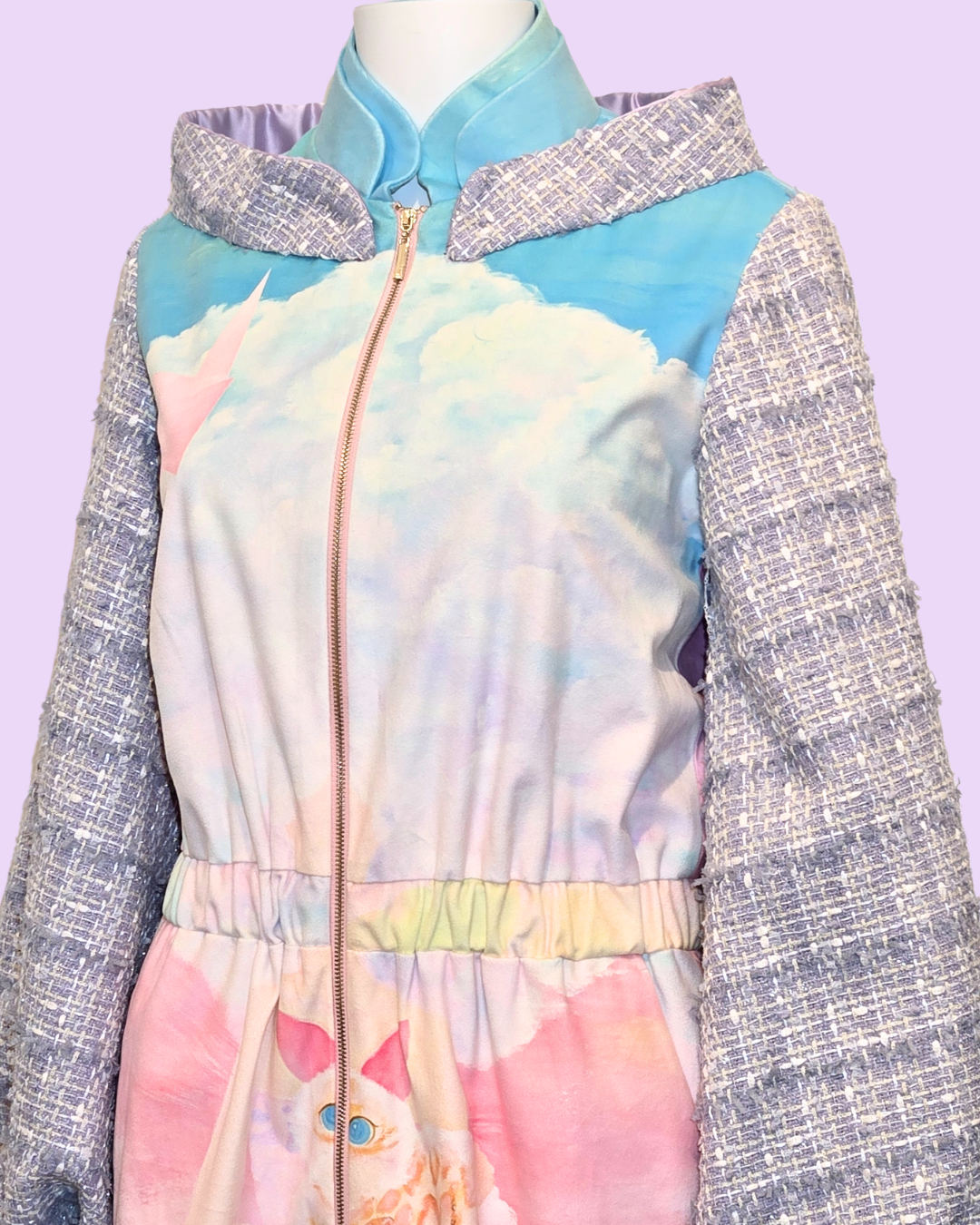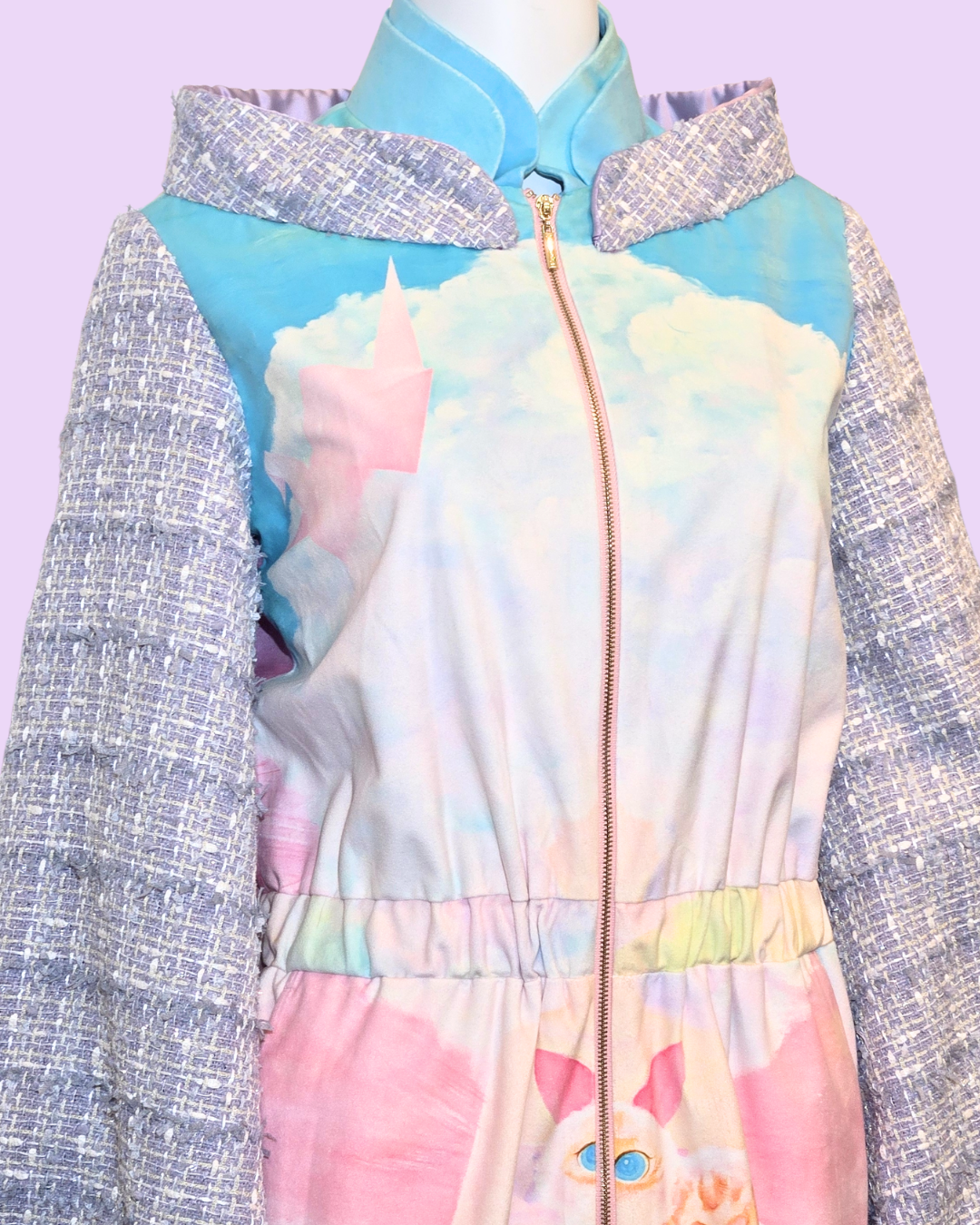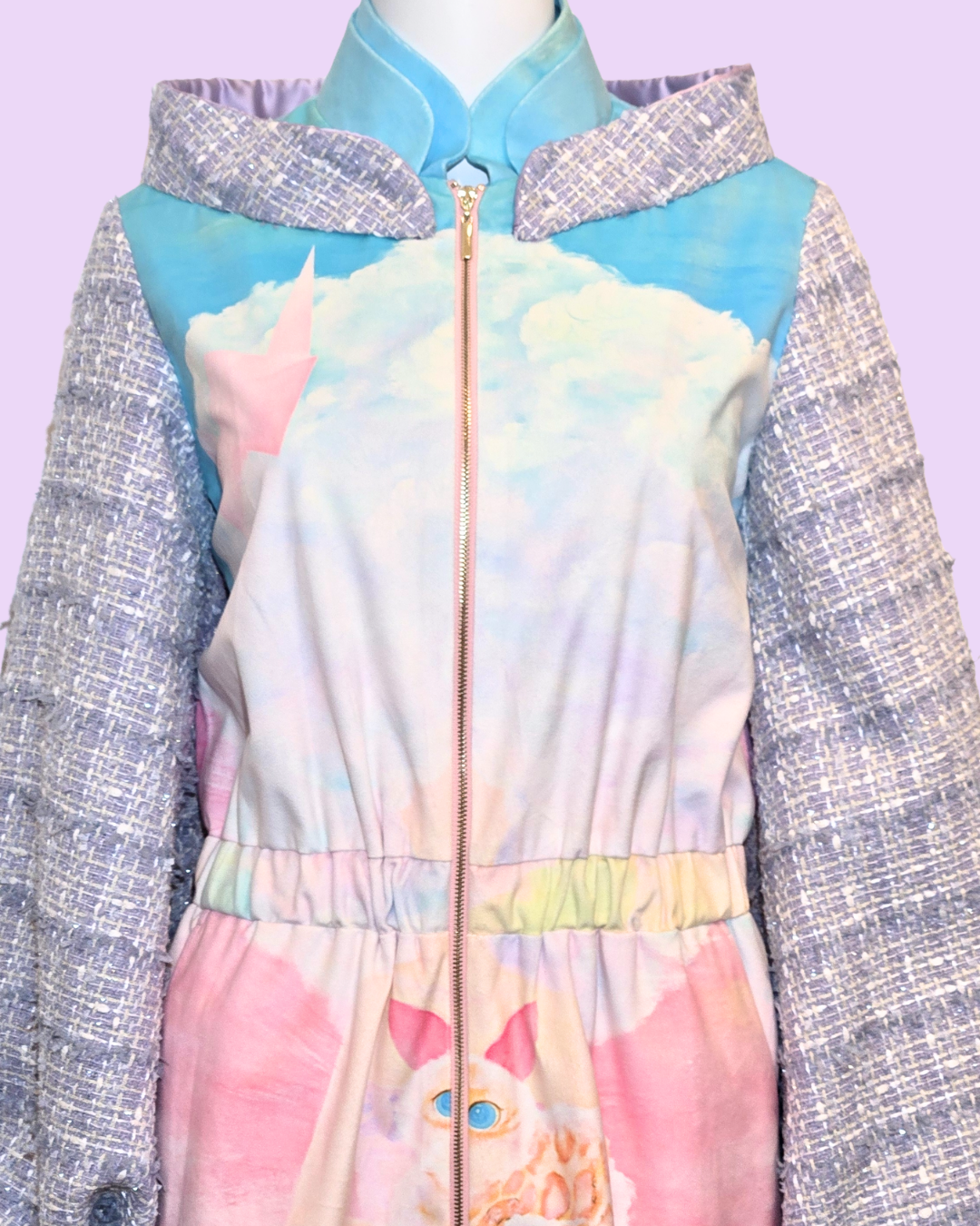 Embrace whimsical style with The Cloud Girl Tweed Jacket. This unique piece features a dreamy design with soft pastel colors and cloud motifs, complemented by textured tweed sleeves for a playful contrast.