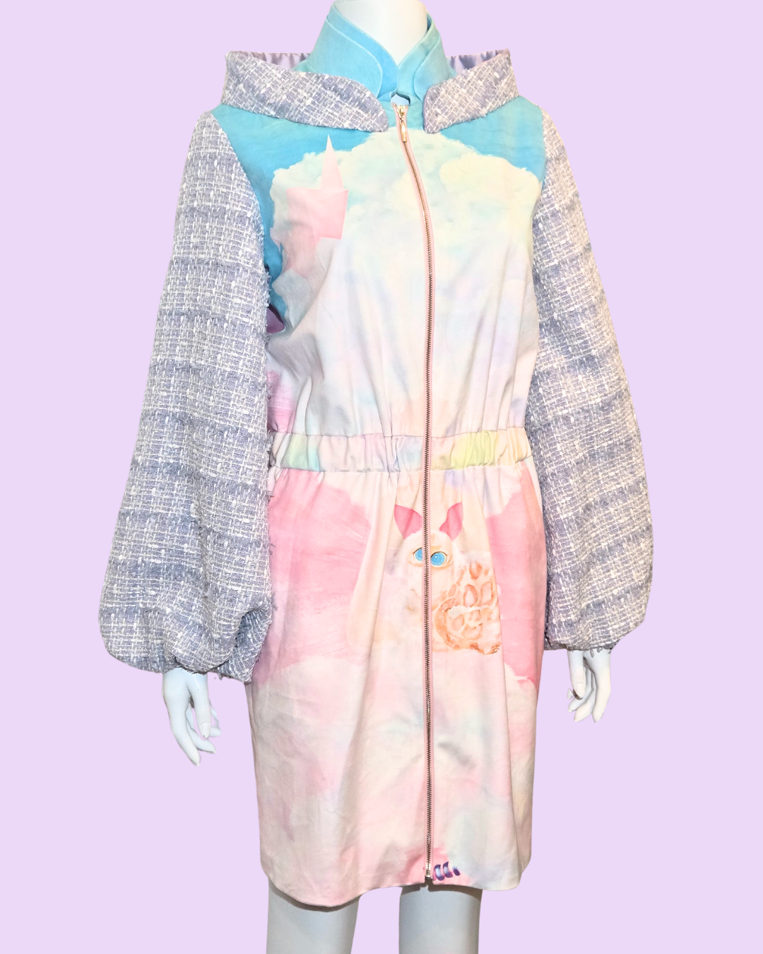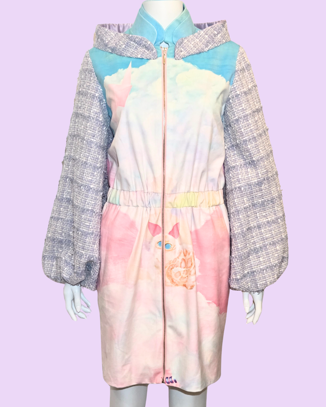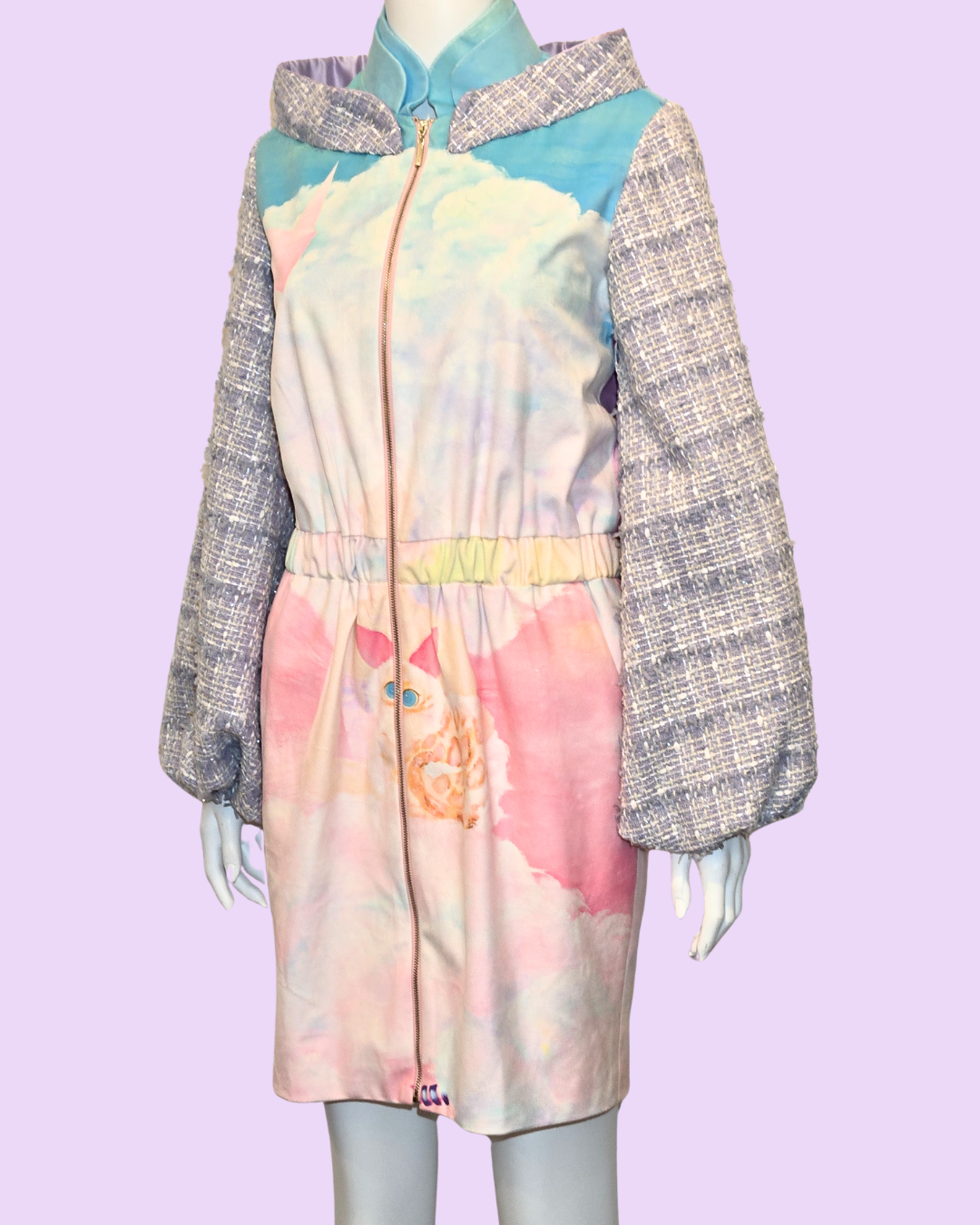 Embrace whimsical style with The Cloud Girl Tweed Jacket. This unique piece features a dreamy design with soft pastel colors and cloud motifs, complemented by textured tweed sleeves for a playful contrast.