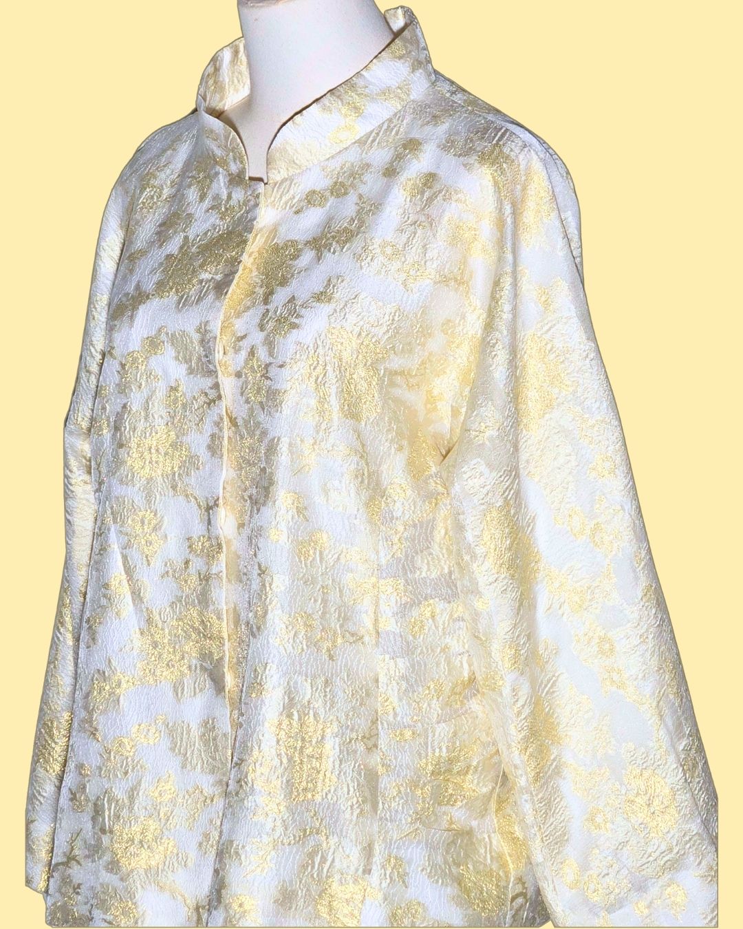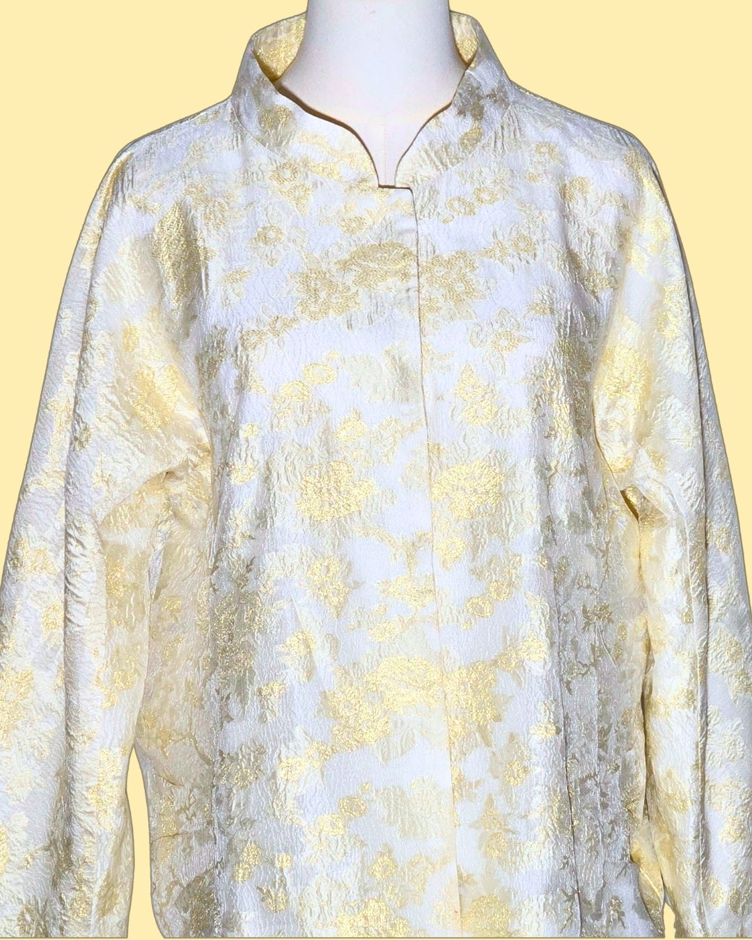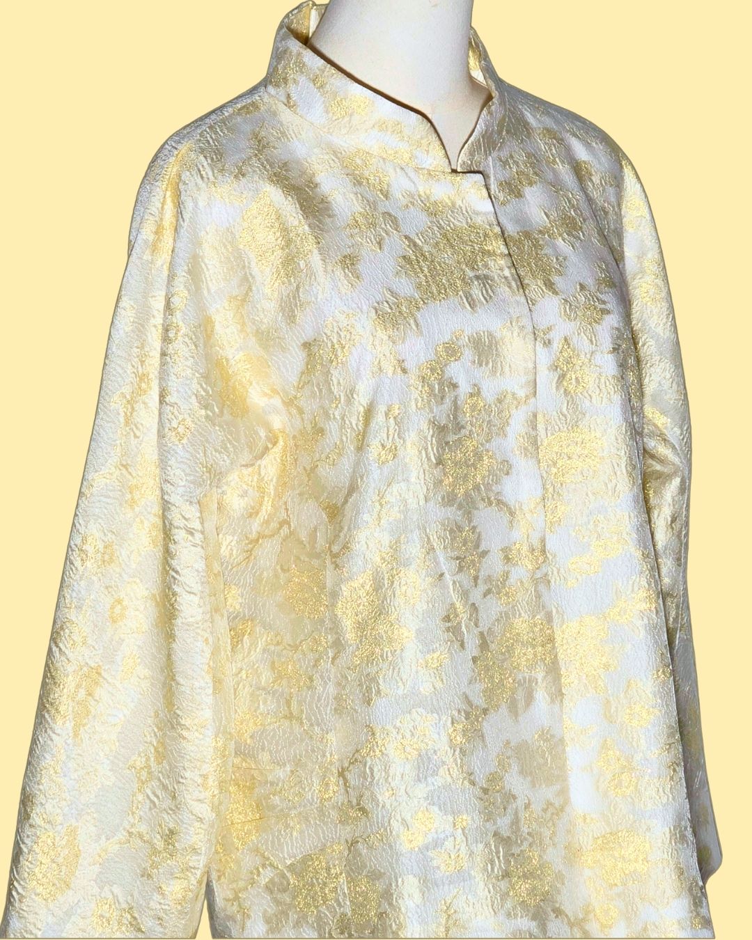 The White and Gold Brocade Tang Jacket exudes sophistication and elegance. Made from luxurious brocade fabric, it features intricate gold patterns that beautifully contrast with the crisp white background. With its relaxed fit and classic design, this jacket is perfect for both formal and casual occasions. Elevate your wardrobe with this timeless piece that celebrates cultural heritage in style.