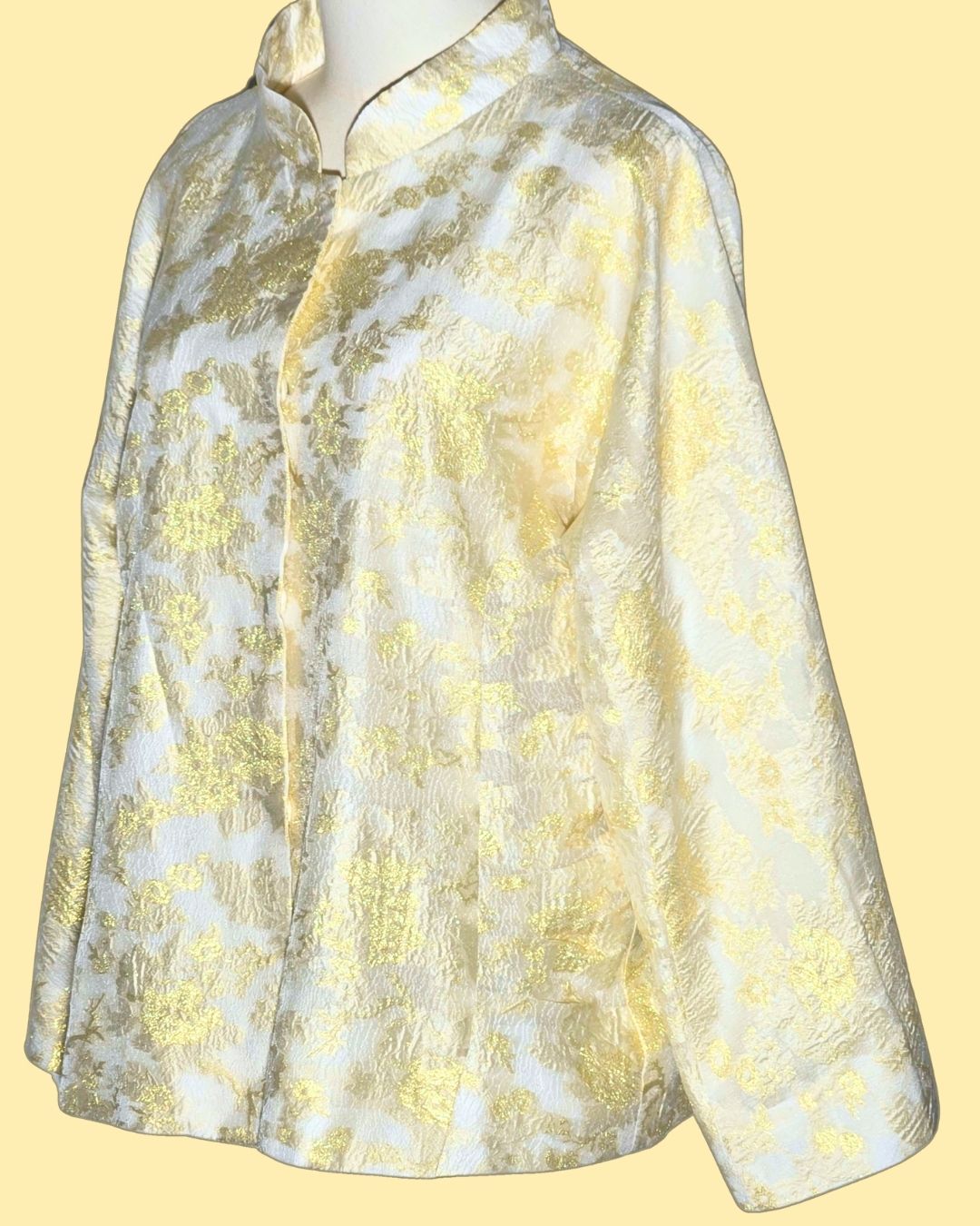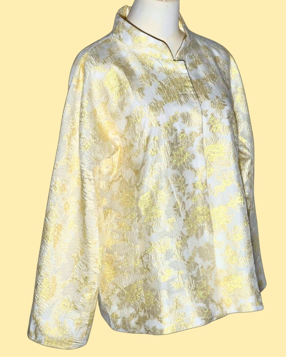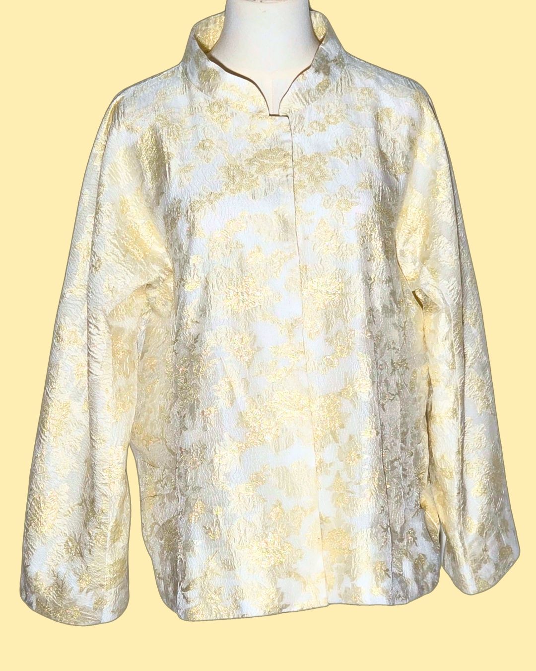 The White and Gold Brocade Tang Jacket exudes sophistication and elegance. Made from luxurious brocade fabric, it features intricate gold patterns that beautifully contrast with the crisp white background. With its relaxed fit and classic design, this jacket is perfect for both formal and casual occasions. Elevate your wardrobe with this timeless piece that celebrates cultural heritage in style.