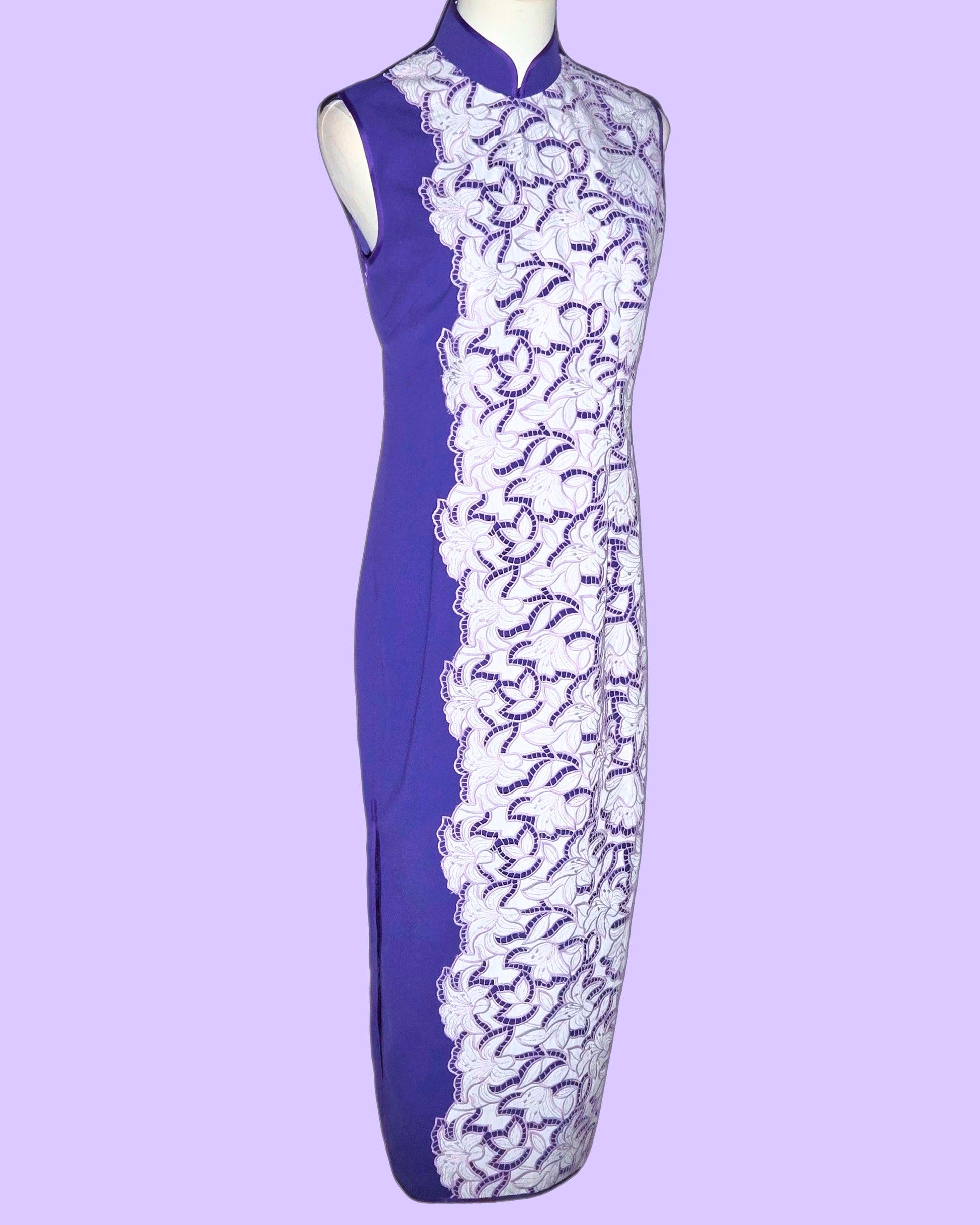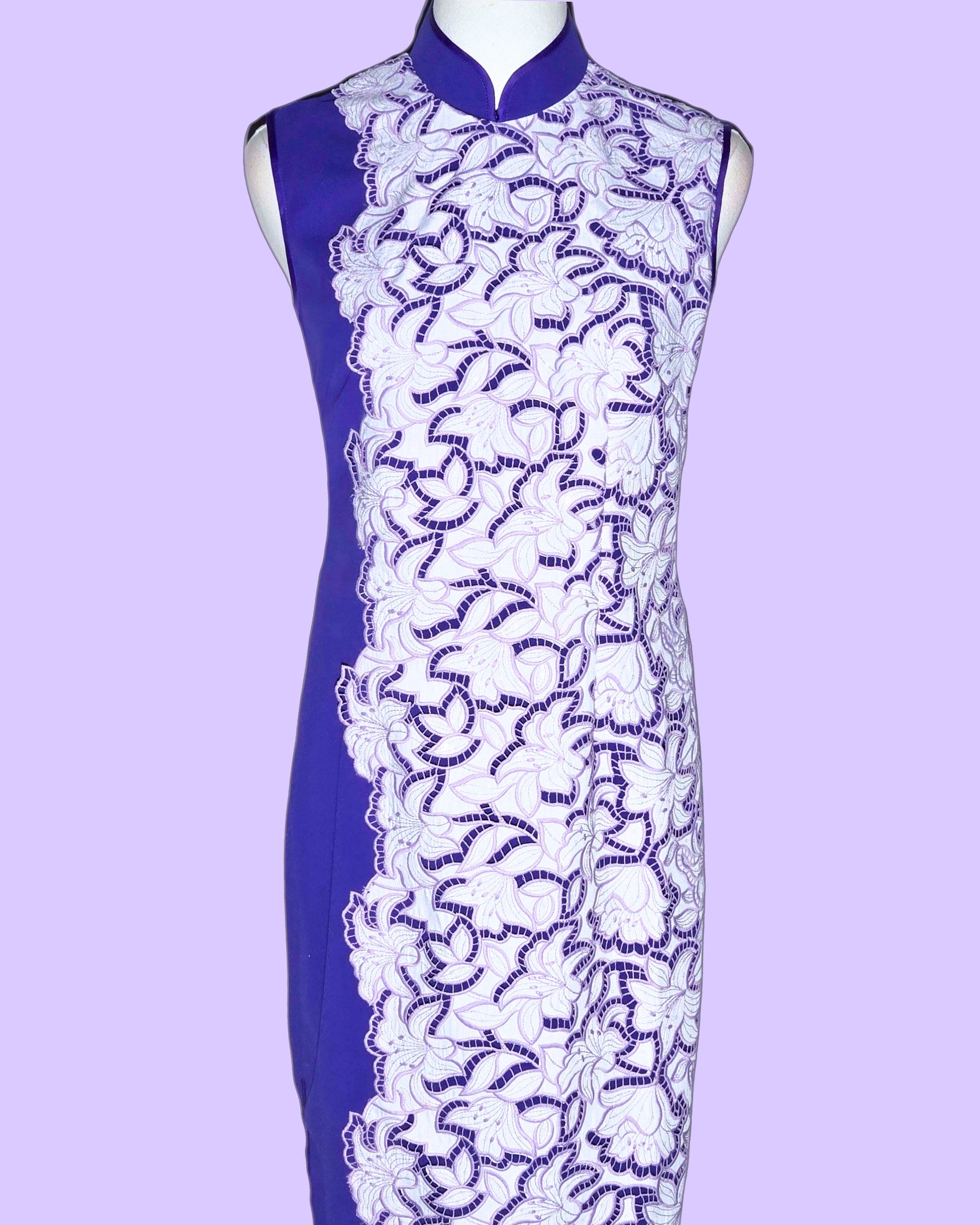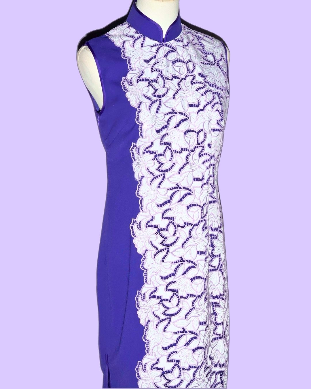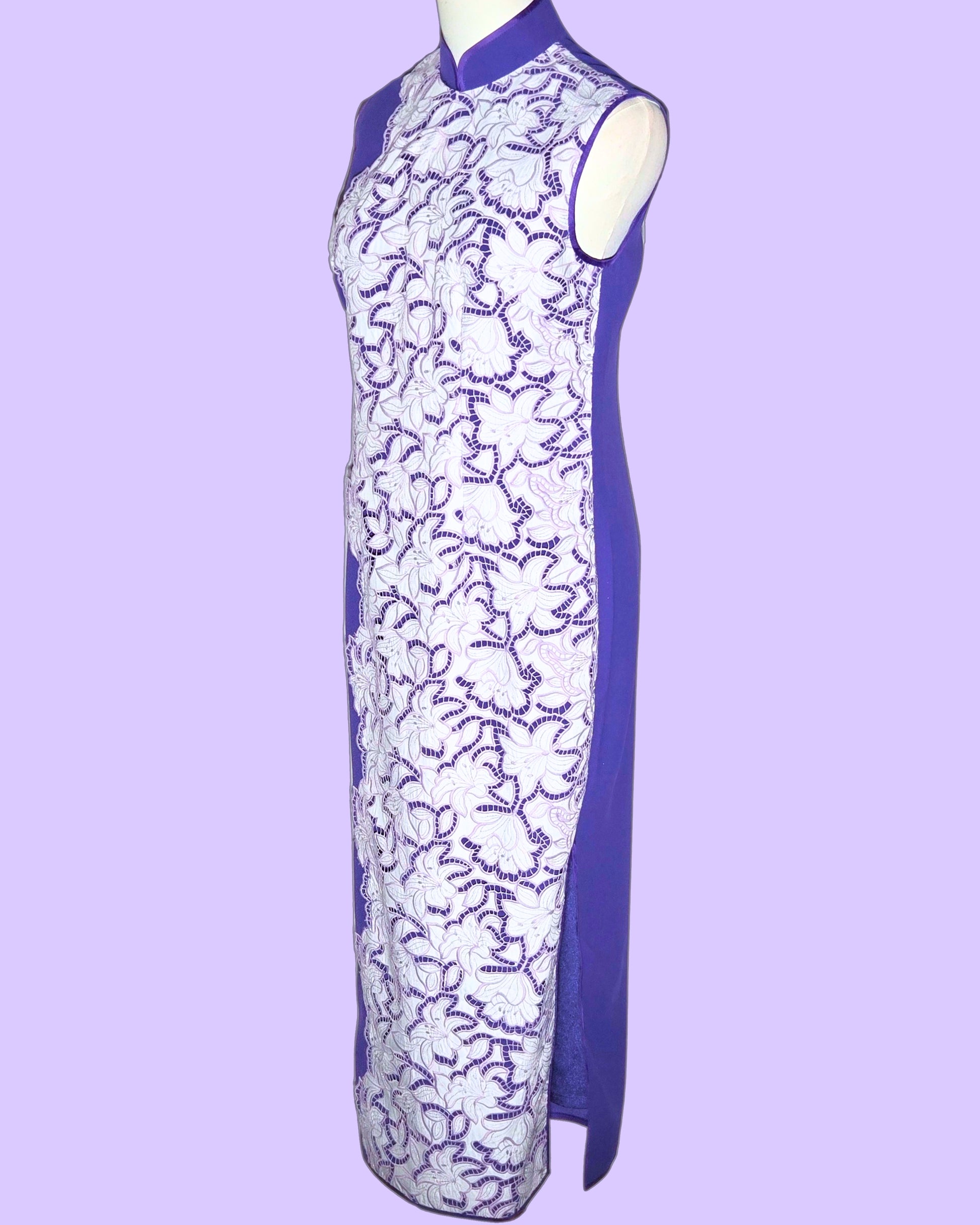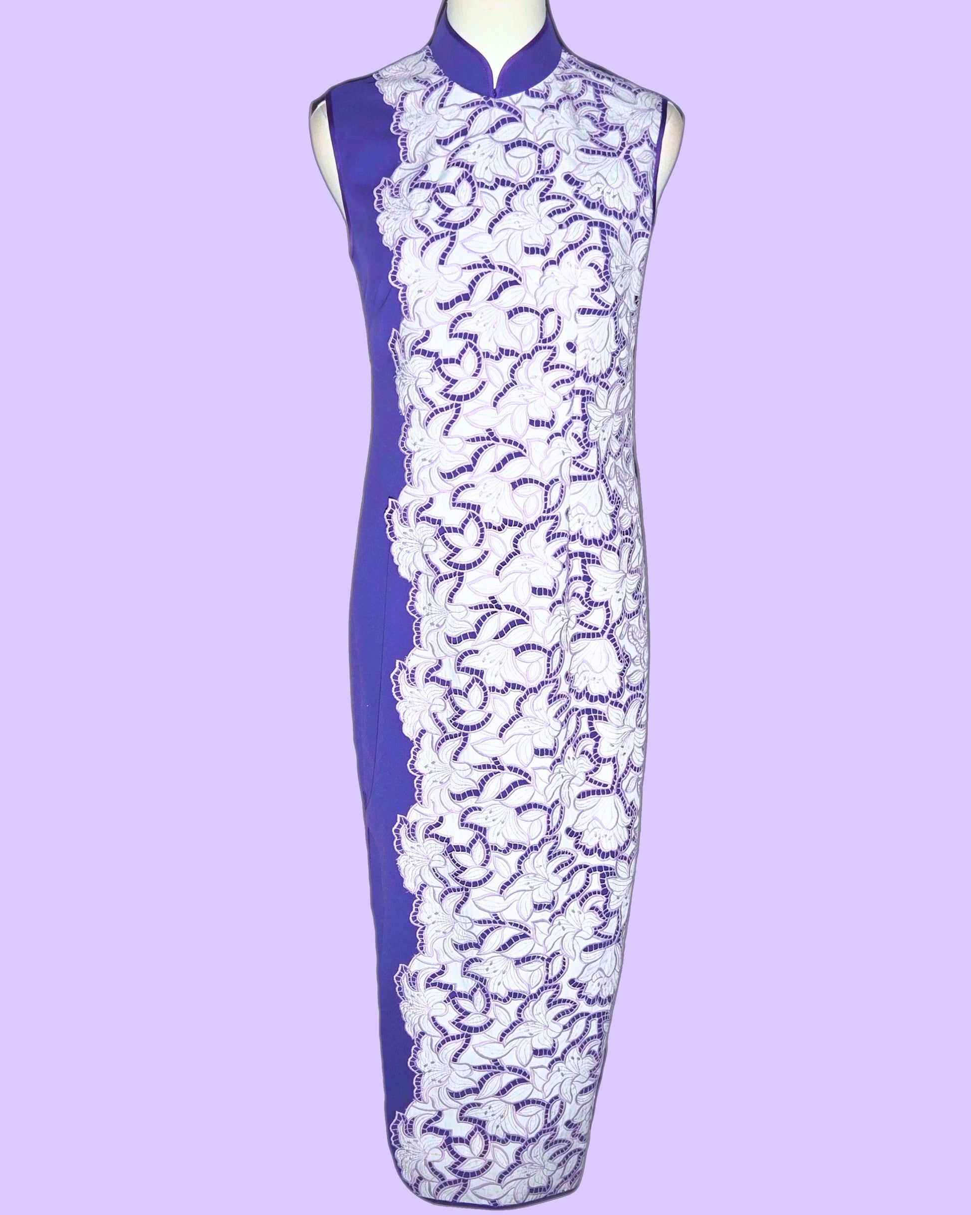 The White Lace and Purple Cheongsam beautifully blends elegance with bold color. Featuring a striking purple base adorned with intricate white lace detailing, this sleeveless design offers a flattering silhouette. Perfect for special occasions, it combines traditional elements with a contemporary flair, making it a standout piece that celebrates grace and individuality.